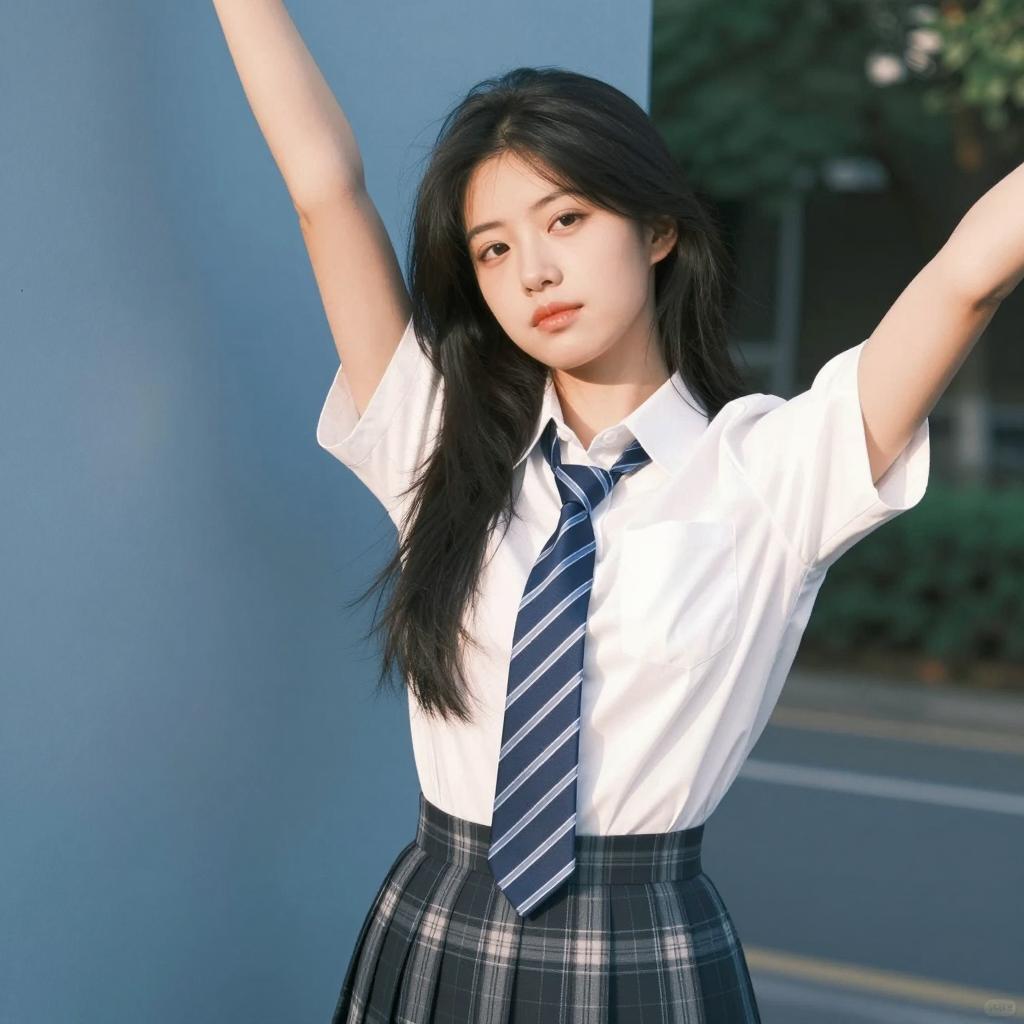 Asian woman with long black hair, standing against a blue wall, arms raised. She wears a white short-sleeve shirt, blue striped tie, and high-waisted dark plaid skirt. Soft natural light, blurred greenery in the background. She looks slightly to the side, expression neutral. Her shirt is slightly tucked in, tie loose. Sunlight illuminates her face and hair.