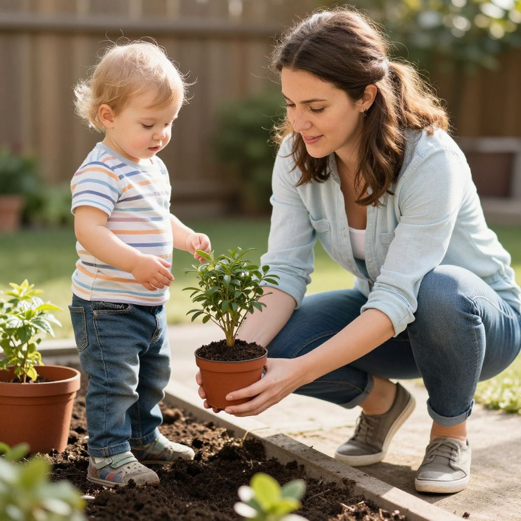 A photograph of a light-skinned woman with brown hair in a ponytail, wearing a light blue denim shirt and jeans, kneeling in a sunlit garden. She is smiling as she tends to small potted plants with her blonde-haired, light-skinned toddler, dressed in a light blue shirt and blue jeans, standing beside her. The background is blurred with green foliage and hints of a brown brick building. The woman holds a green pot with one hand and a red pot with the other, while the toddler's hand rests on her shoulder. Sunlight creates a warm, natural glow.