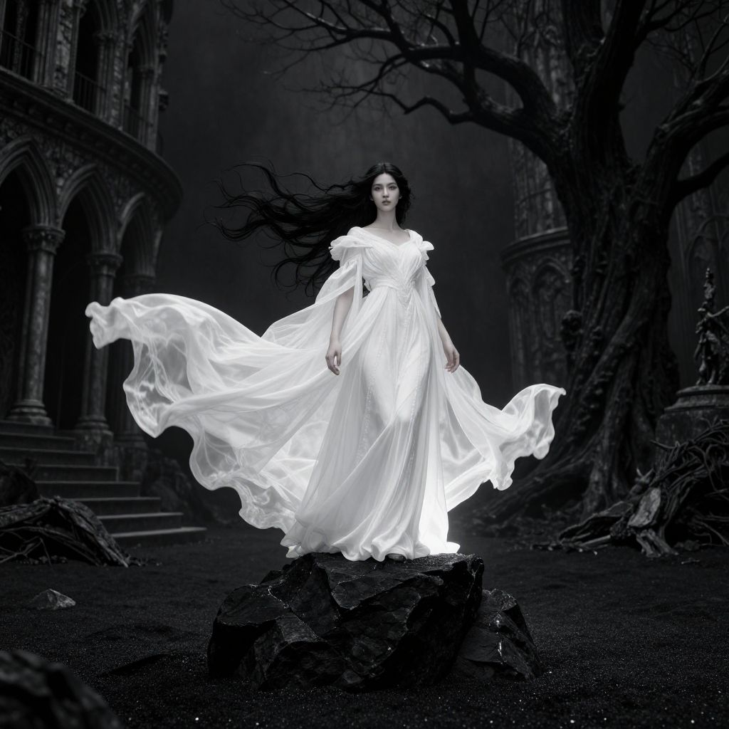 A hyper-realistic digital illustration in HD, 8K rendering, depicting an ethereal beauty inspired by the name *Isolde*, reminiscent of women immortalized in classical art, The pale-skinned woman, with flawless and delicate features, exudes an otherworldly elegance, Her jet-black hair flows dramatically, extending and floating as if weightless, creating a striking contrast against her glowing white medieval gown, The gown is long and exaggerated, its intricate fabric billowing and hovering as if animated by unseen forces, amplifying her ghostly allure, She stands poised atop a jagged black rock boulder, her presence luminous against the ground of fine black sand stretching around her, The background features ominous, darkly rendered elements: crumbling stairs spiraling into shadow, ancient buildings with gothic arches, towering pillars, and a sprawling, exaggerated tree stripped of leaves, its skeletal branches twisting eerily, This monochrome environment creates a stark visual contrast, emphasizing the radiant purity of *Isolde* and her garments, Lit with soft, diffused lighting that casts gentle highlights on her gown and hair, the image achieves cinematic depth with a 50mm lens, f/2 aperture, and subtle focus shifts to capture every fine detail of her ethereal form and the haunting, surreal setting
