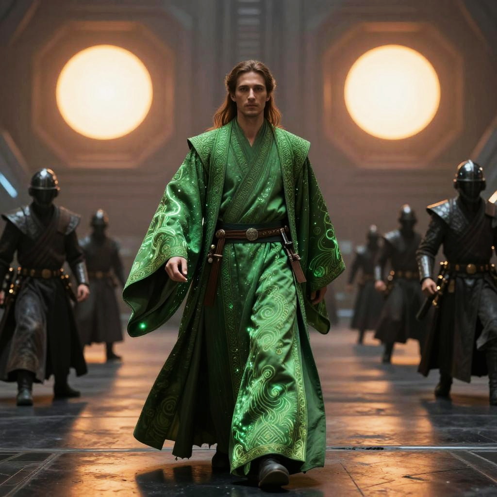 Green Jedi robes flowing in a galactic battle scene, intricate fabric patterns glowing under twin suns, cinematic sci-fi fantasy atmosphere, high detail, dramatic lighting