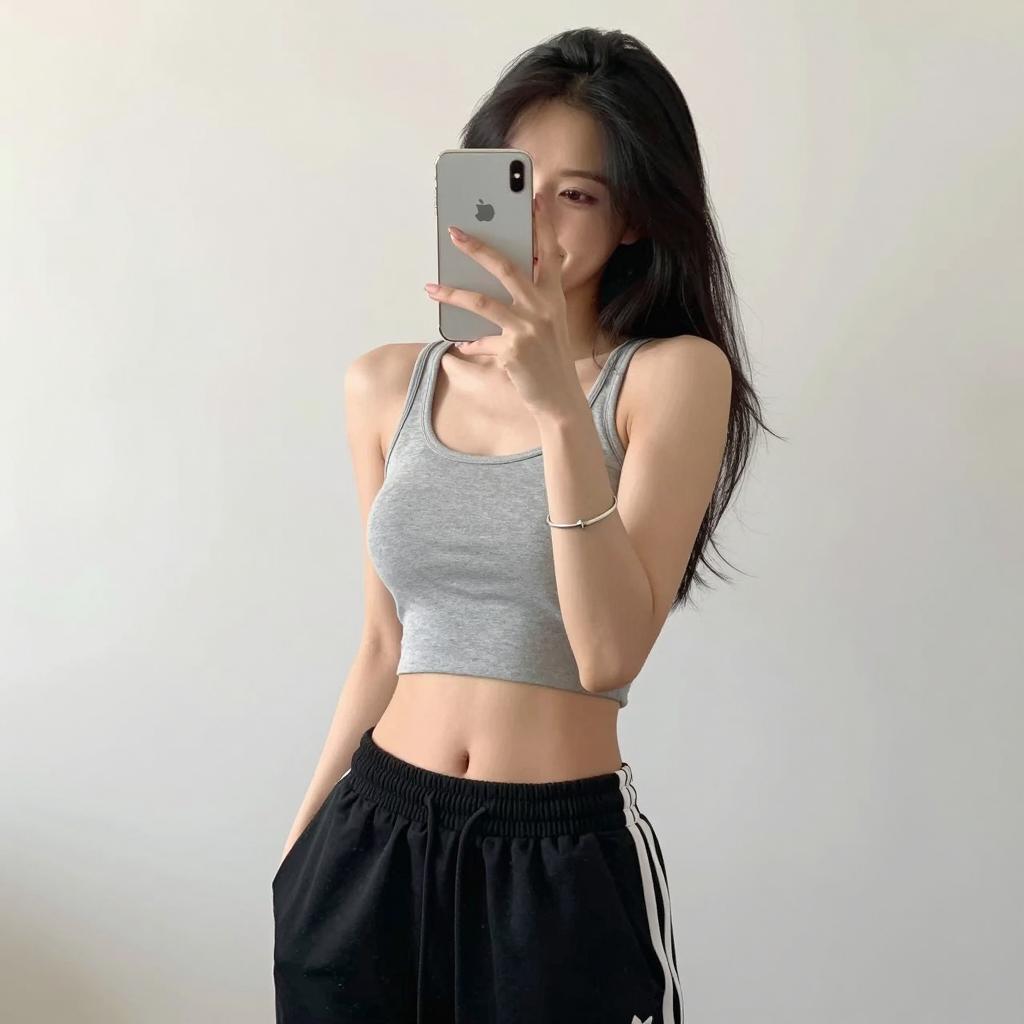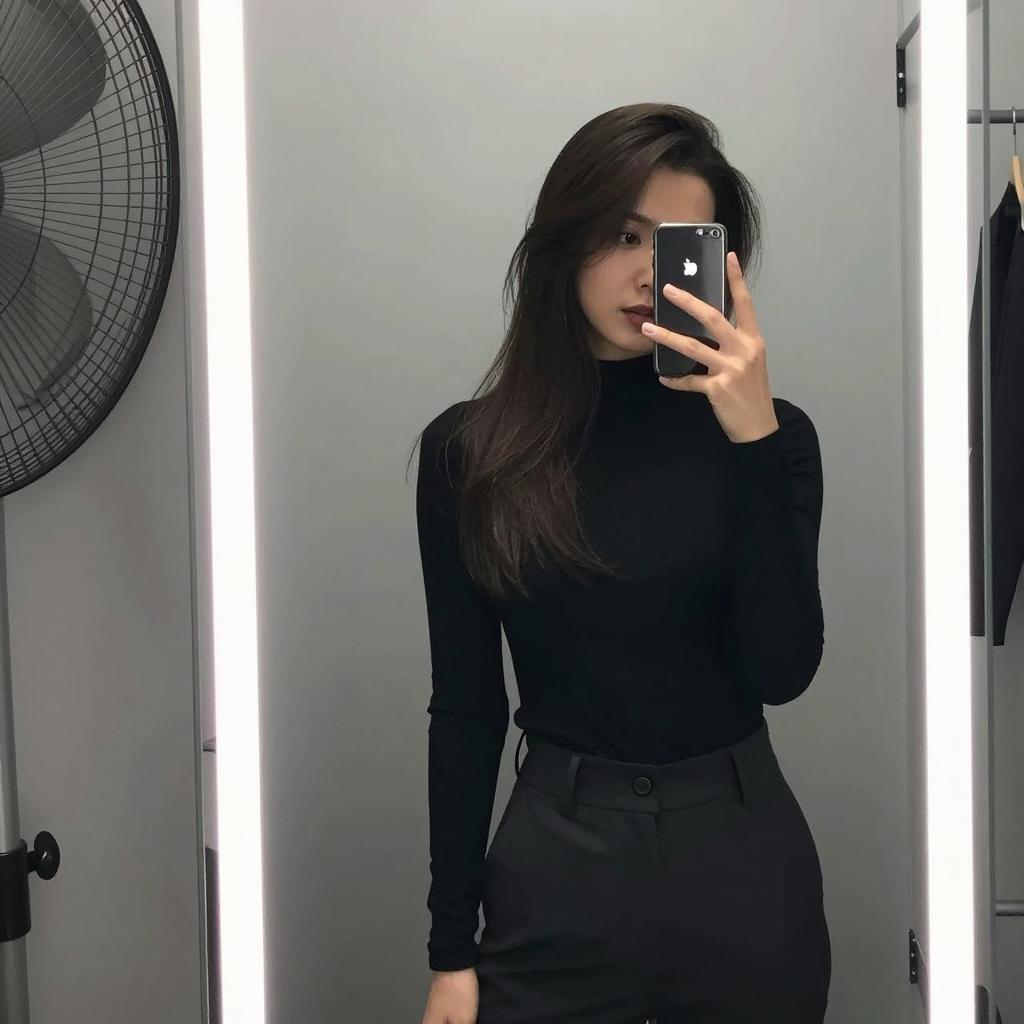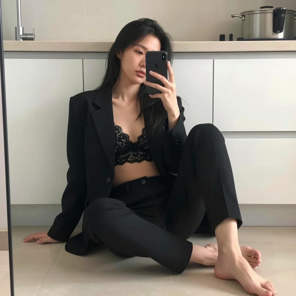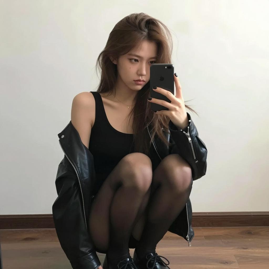Photograph of a young woman with long black hair taking a mirror selfie. She wears a black leather jacket, black bra, and gray sweatpants. Her right hand holds a black smartphone, covering part of her face. She has a neutral expression. The background includes a wooden door and white walls. She stands on a tiled floor.