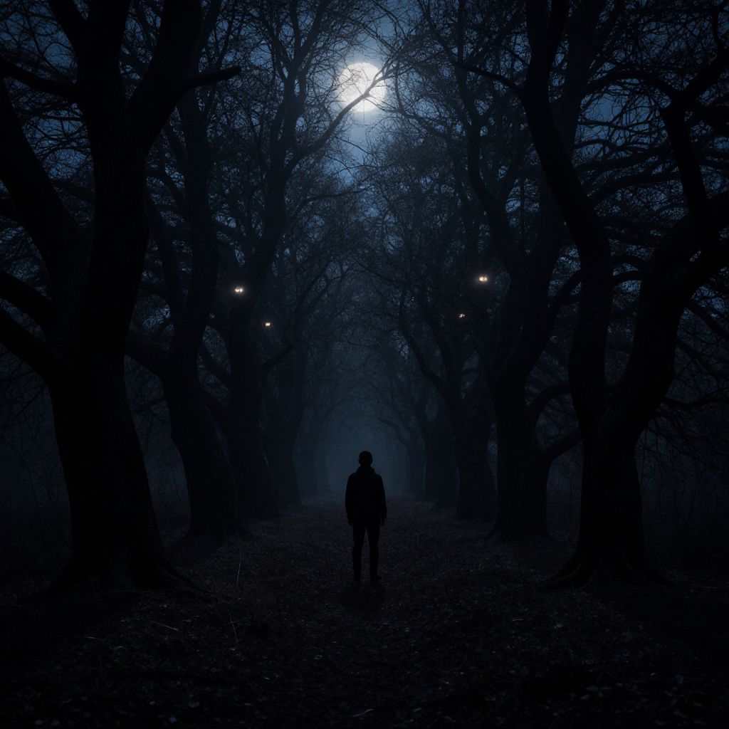 Man standing in dark forest clearing, moonlight filtering through dense twisted trees, mysterious glowing eyes faintly visible in the shadows, cold blue and black palette, surreal and haunting, subtle fog enveloping the scene.