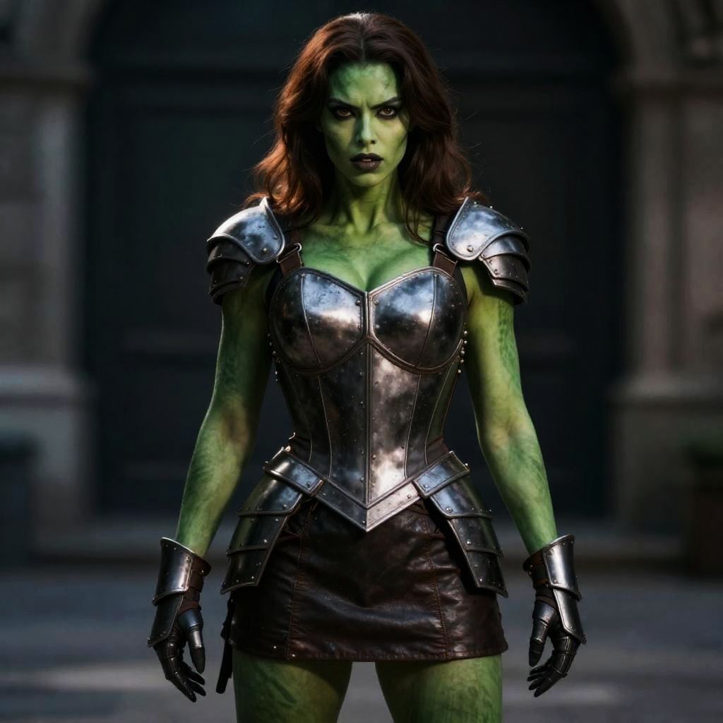 Cinematic photo, 1girls, (night, cyberpunk city background), lae-zel standing in full armor + armored leather miniskirt + brown hair + (medium hair), intimidating expression + [[green]] skin + (skin markings), wide hips, full body pinup, [_:full sharp, detailed face, (detailed eyes + slit pupils + sharp teeth):.24], (absurdres, highliest quality, best quality:1.2), . 35mm photograph, film, bokeh, professional, 4k, highly detailed
