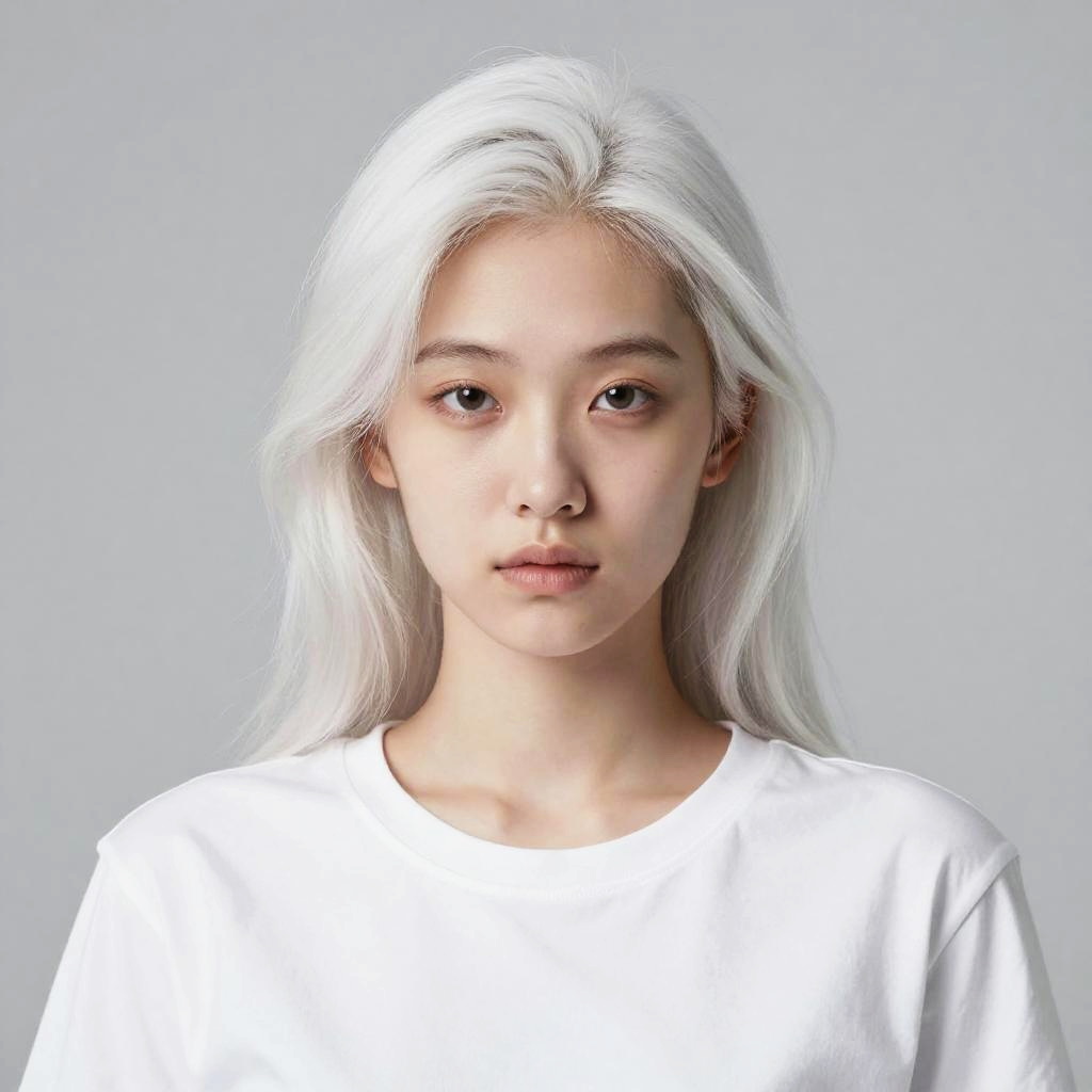 Digital portrait of a young East Asian woman with long, white hair, wearing a white shirt, against a light gray background.