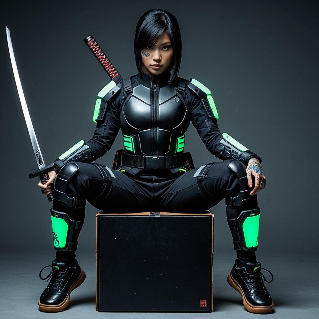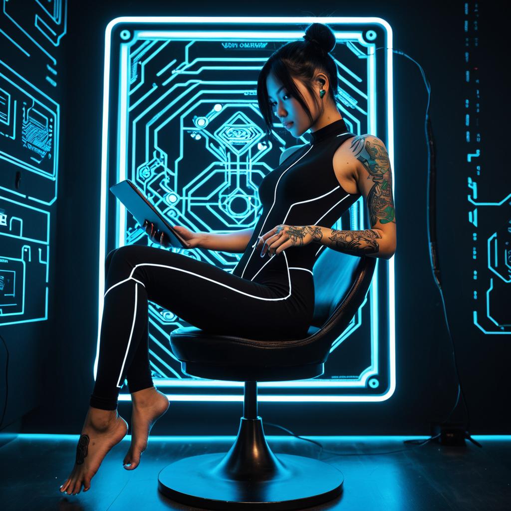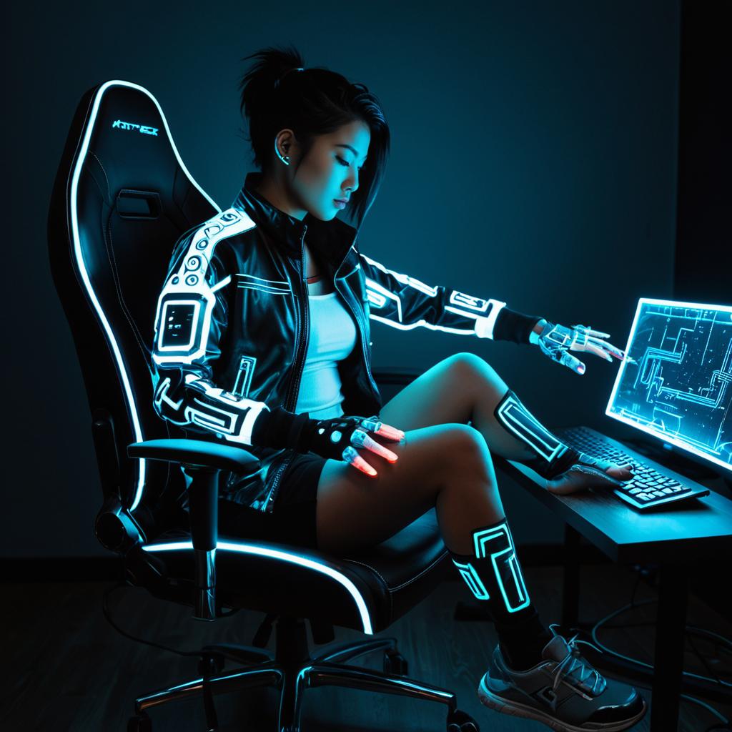 Portrait of an East Asian woman cyberpunk hacker seated on a sleek high-tech gaming chair. She is wearing a neon-lit jacket and fingerless gloves with glowing circuit tattoos on her arms and legs. The hacker interacts with a futuristic holographic interface panel, highlighting a high-tech environment with blue neon lights. She has short dark hair tied in a ponytail and is dressed in a white tank top and black shorts, with the sole of her bare foot resting on a keyboard.