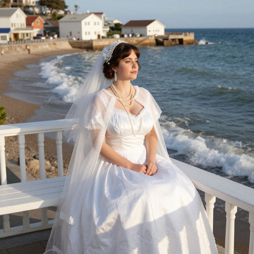 Photograph of a young woman with fair skin and dark hair, wearing a white, lace-trimmed wedding dress and a long, sheer veil adorned with a sparkling tiara. She sits on a white wooden bench on a coastal pier, looking out at the ocean with gentle waves. She wears a pearl necklace and matching earrings. In the background, there are white houses with red roofs along a sandy beach. The sky is clear with a few clouds, and the sunlight casts a warm glow on the scene. The overall atmosphere is serene and romantic.