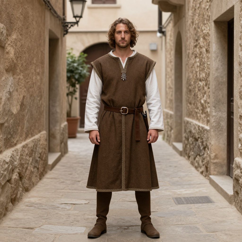 Medieval Villager Costume, man in medieval clothing standing in a narrow alleyway