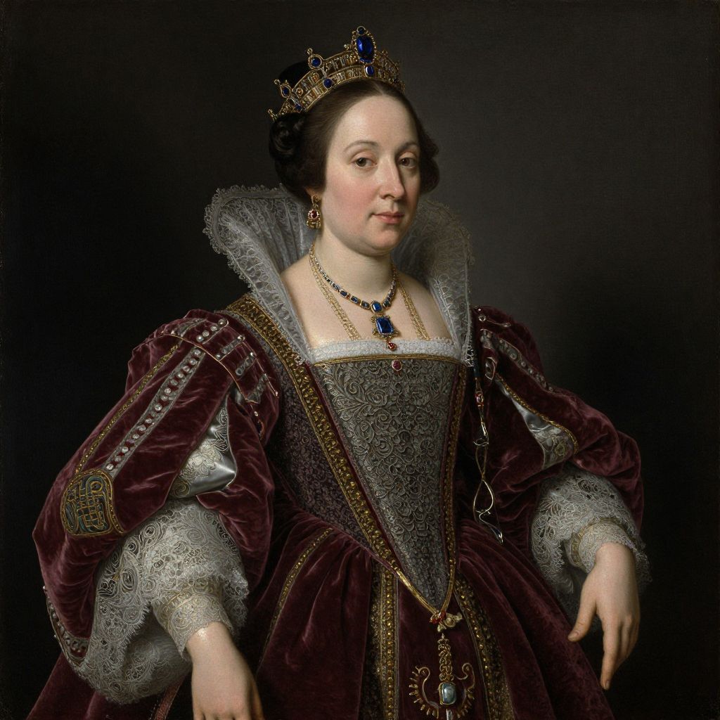 Portrait of a regal woman in an elaborate, embroidered maroon gown with silver lace, wearing a jeweled crown and necklace, against a dark background