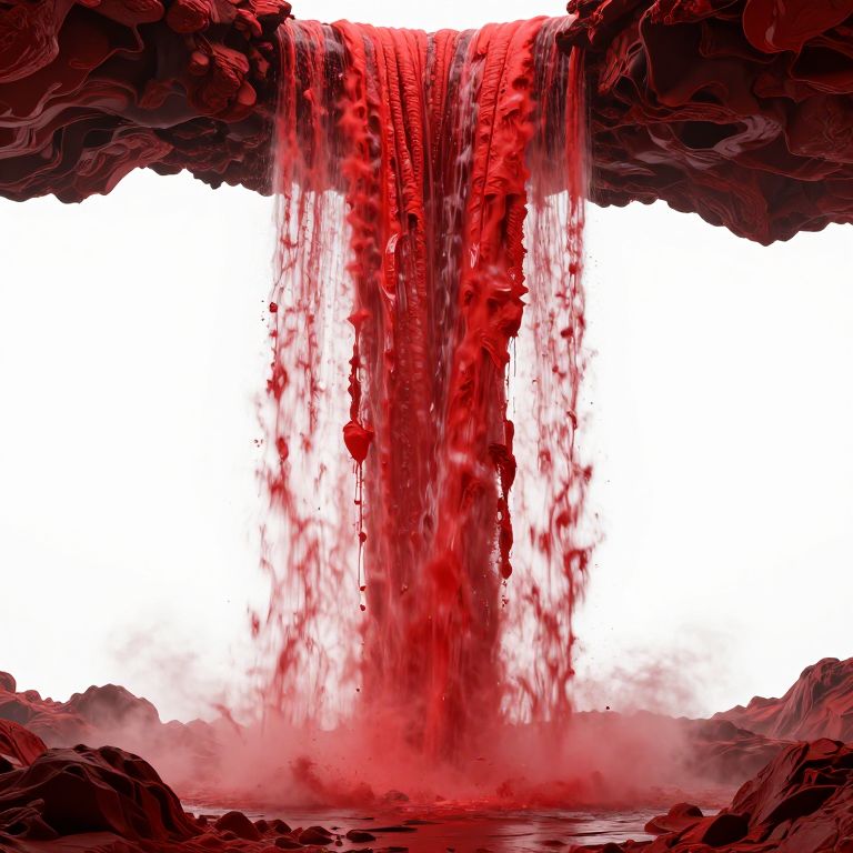 Digital artwork of a vivid red waterfall cascading down dark, rocky cliffs with a bright white background, creating a stark contrast.