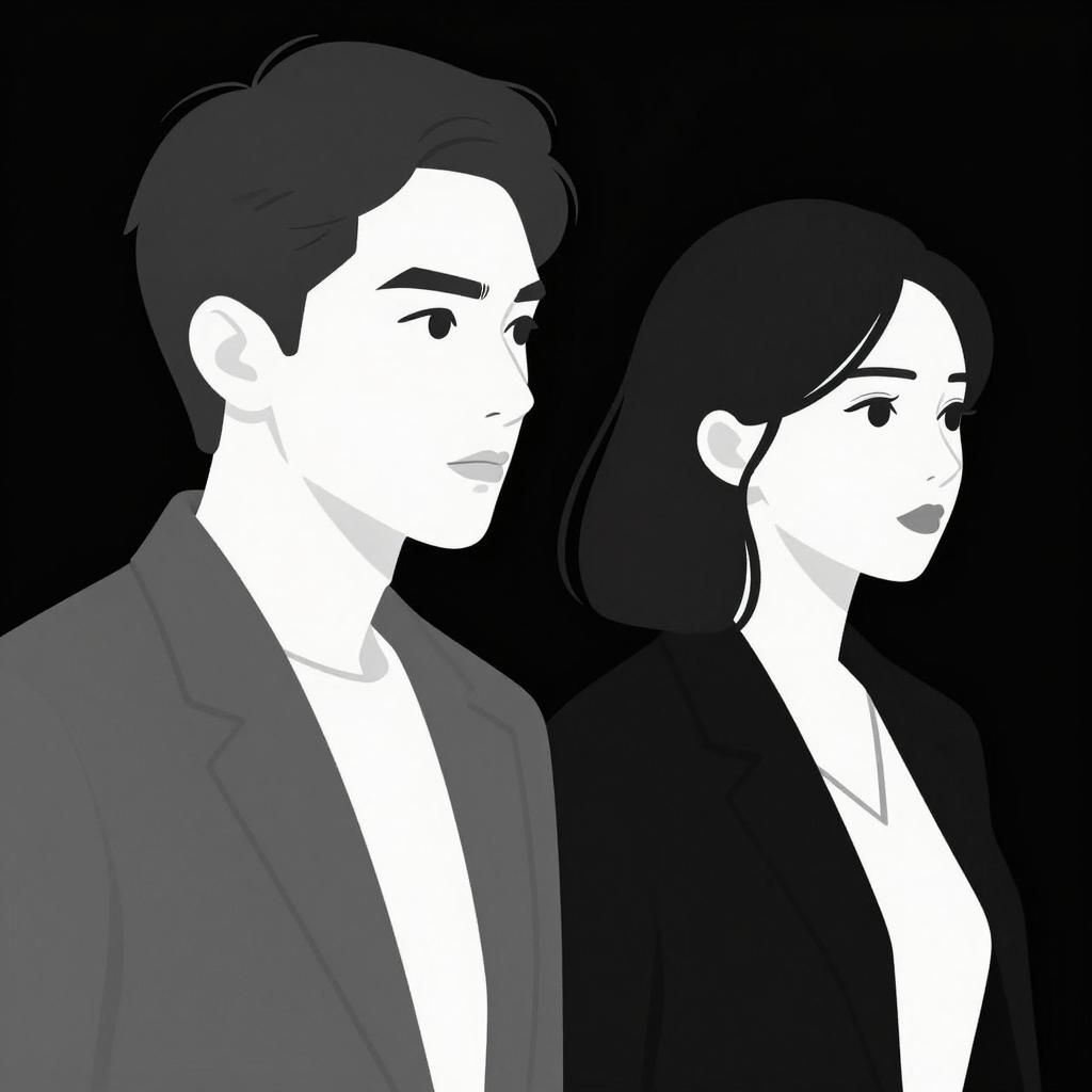 A black-and-white digital illustration featuring a man and a woman with dark hair and light skin. Both figures have intense expressions and are shown in a side profile against a solid black background. The man is wearing a gray blazer and white shirt, and the woman is dressed in a black blazer over a white top. The minimalist style emphasizes their facial features and serious mood.
