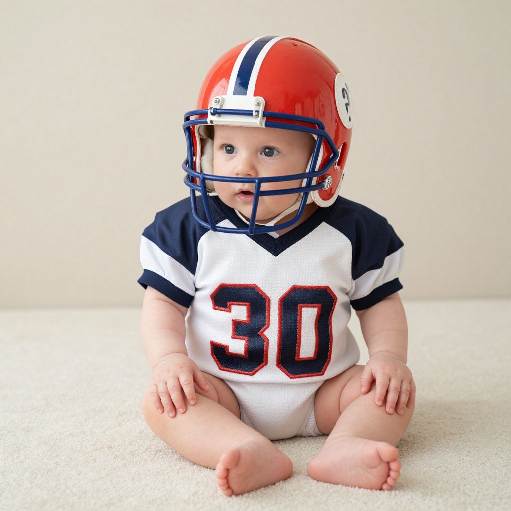 Baby Football Costume, baby sitting on the floor wearing a helmet