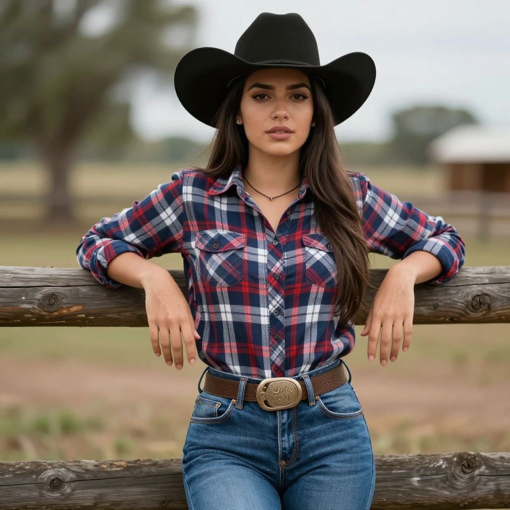 Photograph of a young woman with long dark brown hair, wearing a black cowboy hat, red and blue plaid shirt, and blue jeans with a brown belt featuring a large, decorative buckle. She stands leaning against a weathered wooden fence in a blurred rural setting with green fields and trees in the background. Her expression is neutral, and she has a delicate necklace around her neck. The image has a soft focus, highlighting her while blurring the background.