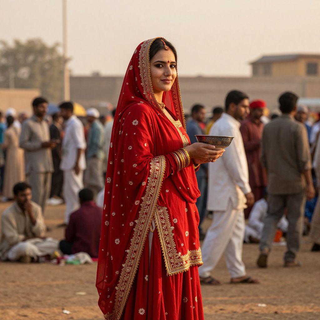 Photograph of an Indian woman standing in a bustling outdoor market. She has a medium brown complexion, black hair partially covered by a red saree adorned with intricate gold embroidery. She wears a gold necklace and holds a small metallic bowl in her right hand. Her expression is calm and composed. The background is filled with blurred, diverse men in traditional attire, some seated and some standing, with a mix of colors including white, grey, and blue. The ground is dirt, and the sky is clear. The overall scene is vibrant and culturally rich.