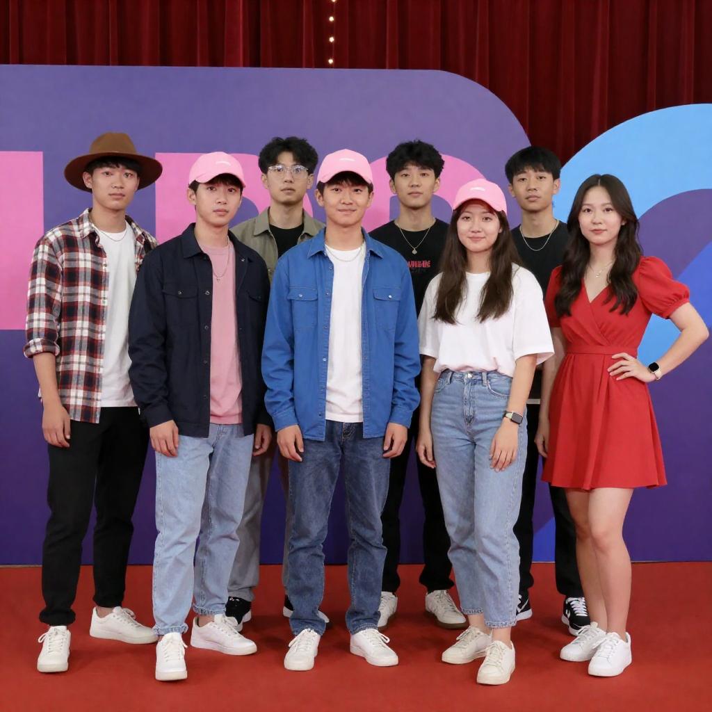 Male DJ in purple jacket, black cap, jeans, and white sneakers, points to white boombox on stage. Crowded audience in background, some taking photos. Dim lighting, foggy atmosphere. Male DJ's arms crossed, focused expression.