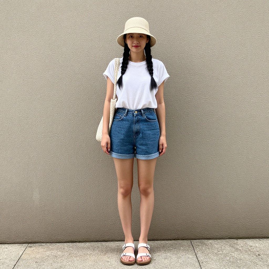 Photograph of an East Asian woman standing against a plain, light-gray textured wall. She has long black pigtails and wears a beige bucket hat, white short-sleeve t-shirt, high-waisted blue denim shorts, and black flip-flops. She carries a small white crossbody bag on her right side. Her expression is neutral, and she stands with her arms relaxed at her sides. The concrete ground is visible at the bottom of the image. The overall style is casual and summery.