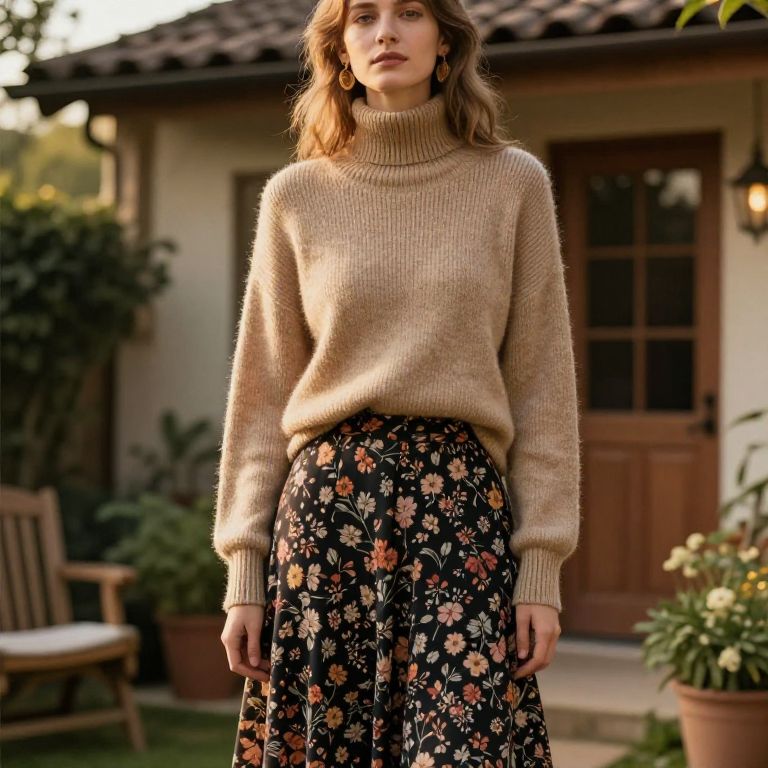 Highneck ootd with a structured high-neck sweater in earthy beige, layered over a midi floral skirt, standing in a cozy cottage garden, golden hour light, bohemian yet refined vibe, Flux style composition.