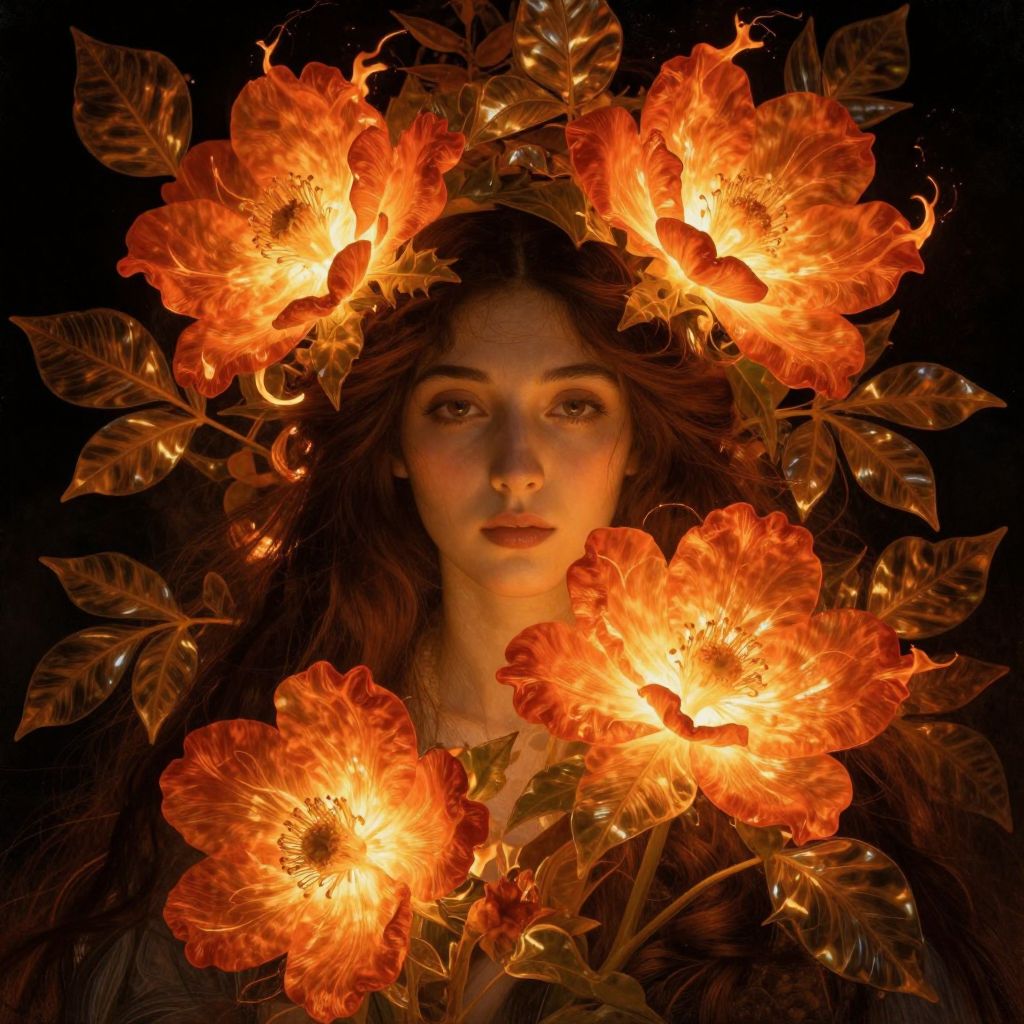 The image depicts a striking and ethereal scene, reminiscent of Pre-Raphaelite art, with a strong influence from Botticelli's works. A woman with long, dark hair is the central figure, adorned with a crown of fiery flowers and leaves that emit an intense, warm glow. The flowers, with their vibrant orange and red hues, are intricately detailed, their petals and stamens rendered with a high degree of realism. The leaves, some of which are translucent, add a sense of depth and movement to the composition. The woman's face is partially obscured by the flowers, creating a sense of mystery and allure. Her expression is serene, almost contemplative, as she gazes directly at the viewer. The background is dark, almost black, which contrasts sharply with the bright, fiery flowers and enhances their luminosity. The overall composition is balanced, with the flowers and leaves framing the woman's face and creating a harmonious visual rhythm. The interplay of light and shadow, along with the rich textures of the flowers and leaves, adds a sense of depth and dimension to the image, making it a captivating and visually striking piece of art.