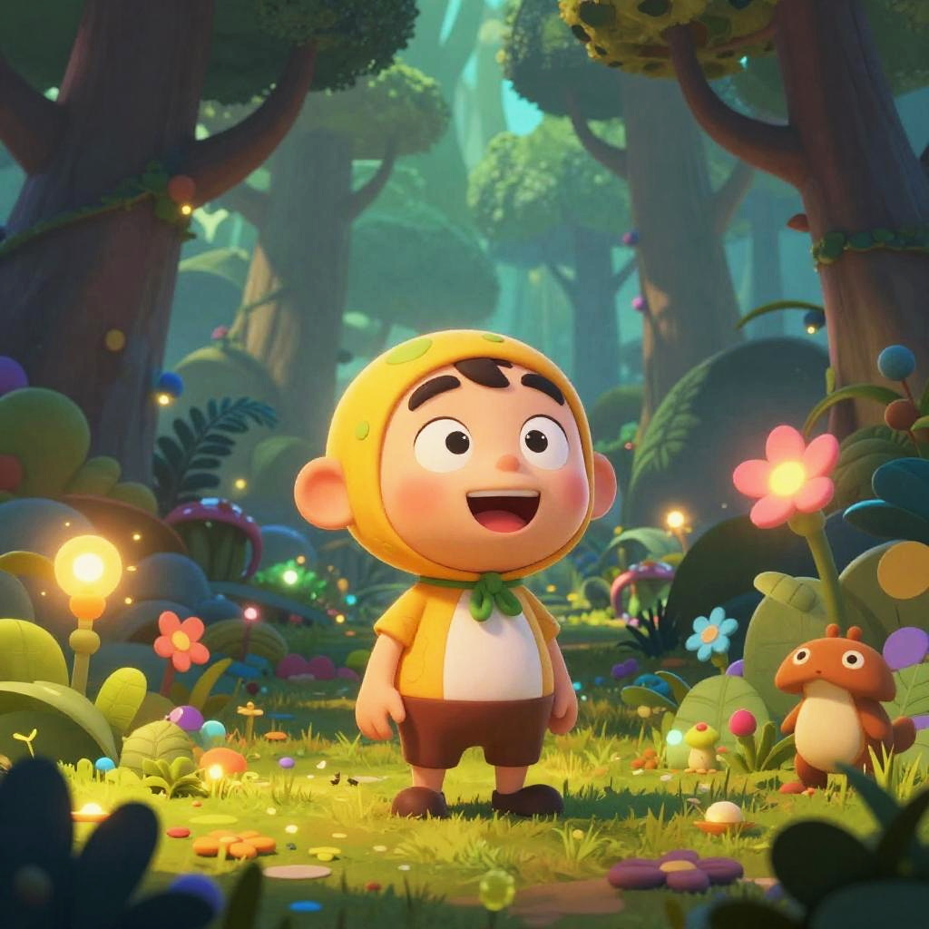 A vibrant, digital cartoon image depicts a chubby, smiling boy with large eyes and a yellow hood, wearing a white shirt and brown shorts, standing in a magical forest. The forest is lush with colorful flowers, glowing mushrooms, and tall trees. A small, orange, mouse-like creature with round eyes stands nearby. The background features a soft, blue-green light filtering through the trees, creating a whimsical, enchanting atmosphere. The boy's joyful expression and the playful, colorful environment evoke a sense of wonder and adventure.