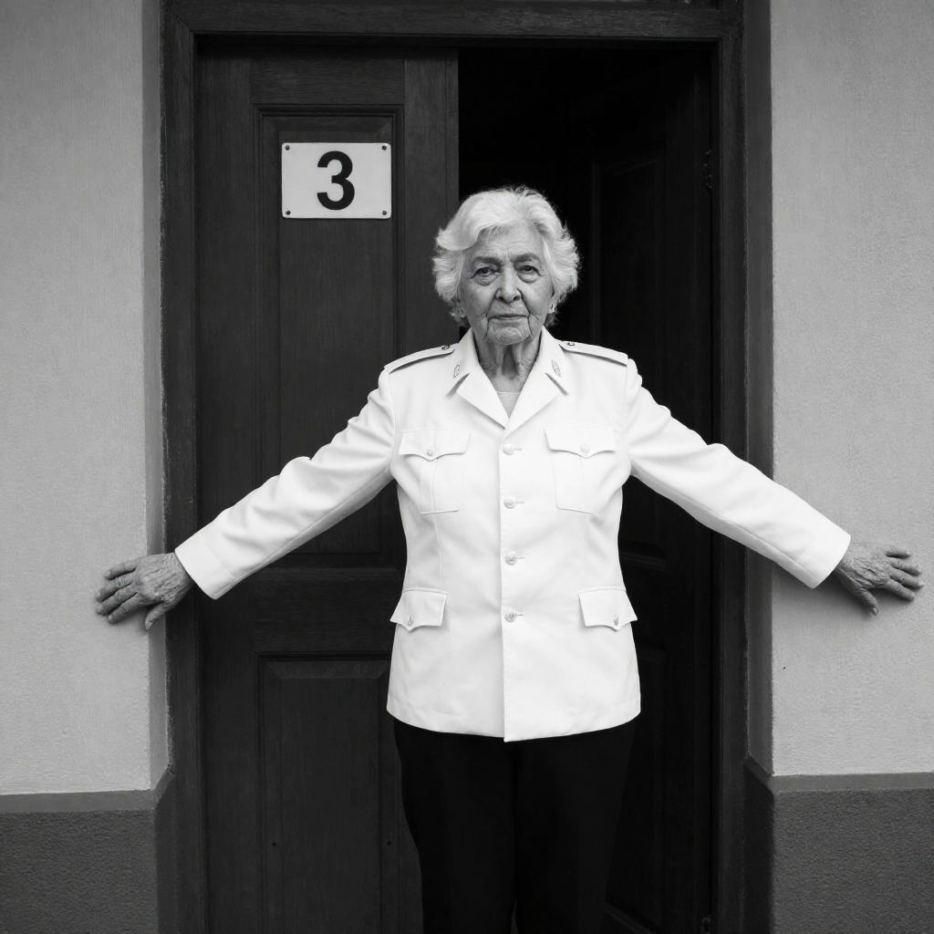 Black-and-white photograph of an elderly woman with white hair, wearing a white military-style jacket with shoulder epaulettes, black pants, and standing in a doorway. She has her arms outstretched to the sides. Wooden door behind her. Door partially open. Wall with ured pattern. Woman's expression is serious. Numbered sign on door.