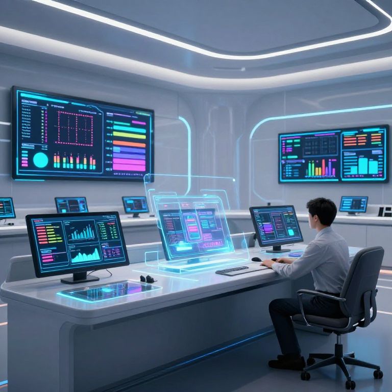 Photograph of a modern, futuristic control room with a white, sleek interior. A male operator with short dark hair, wearing a white shirt and black pants, sits at a white desk, typing on a keyboard in front of multiple glowing, high-definition monitors displaying colorful graphs, charts, and data streams. The room is illuminated by soft, blue and white LED lighting. Four large screens are mounted on the curved white wall behind the desk, displaying detailed, multicolored data. The overall atmosphere is high-tech and professional.