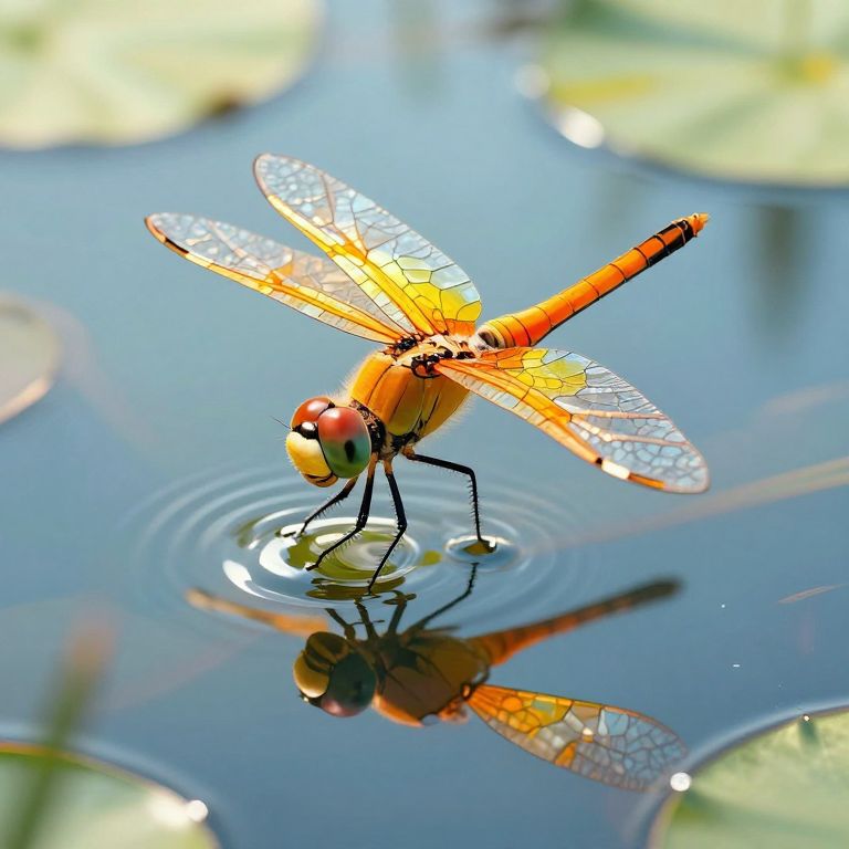 A vibrant digital illustration of a dragonfly with translucent, stained-glass-like wings perches delicately on a ripple-disturbed surface, its vivid orange and yellow hues mirrored in the serene pool below, evoking a dreamlike, high-definition ambiance of quiet ambition and natural beauty.