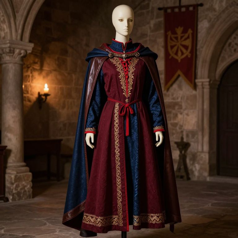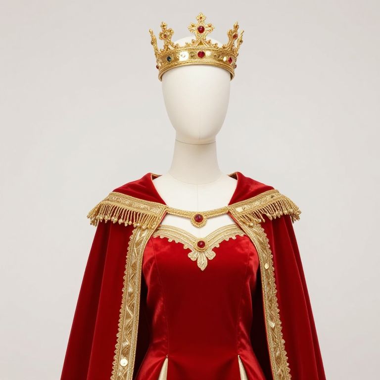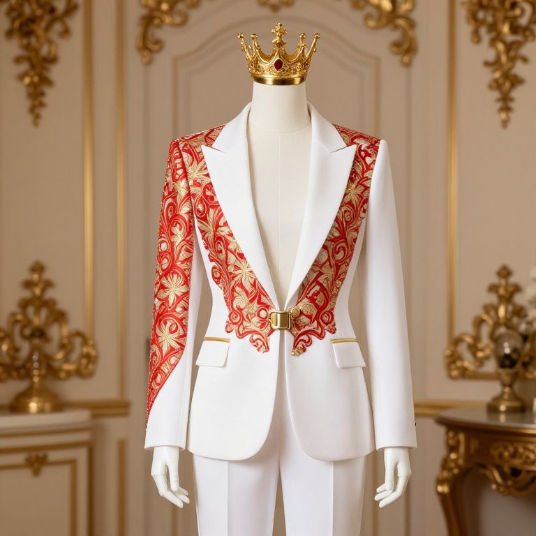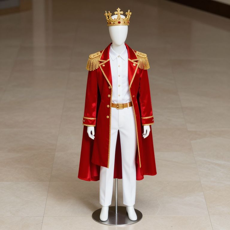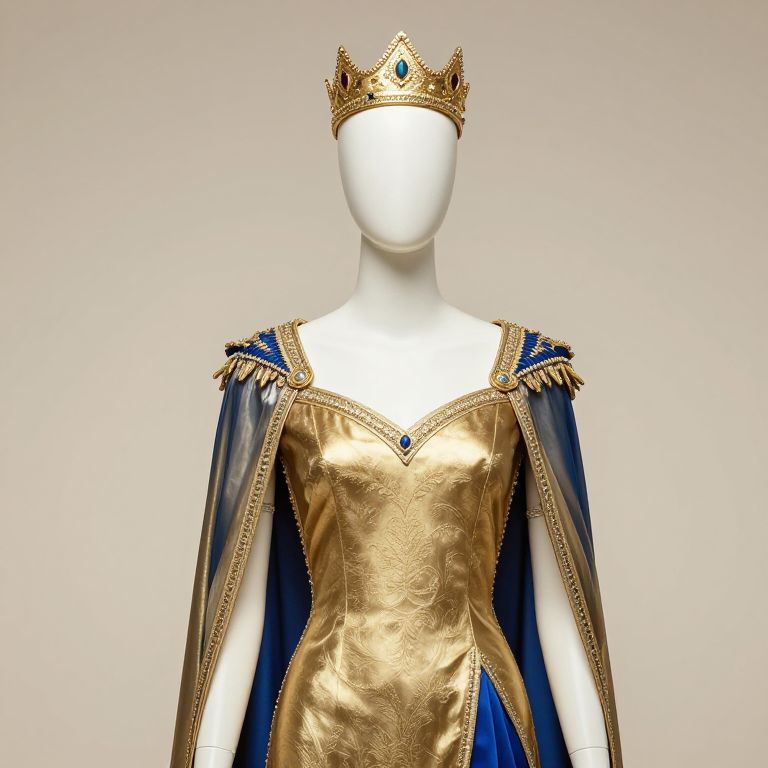 A mannequin standing confidently in a stylized storefront, wearing a vibrant blue and gold outfit with intricate embroidery, a flowing cape, and a golden crown resting on his head. The mannequin has a sleek, humanoid figure with detailed fabric textures and a slightly elegant, regal pose, as if he is the king of a fictional fashion realm. The background features a modern, neon-lit cityscape with soft light reflections, enhancing the luxurious and imaginative atmosphere. The overall mood is bold, elegant, and whimsical.