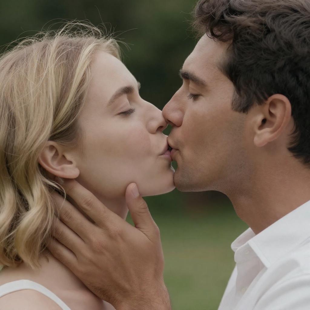 Photograph of a blonde woman with shoulder-length hair kissing the cheek of a dark-haired man. She holds his face gently with red-painted nails. He looks to the side with a slight smile. Both wear casual clothes. Blue curtains in the background. The man wears a gray sleeveless shirt. The woman's outfit features a patterned sleeve.