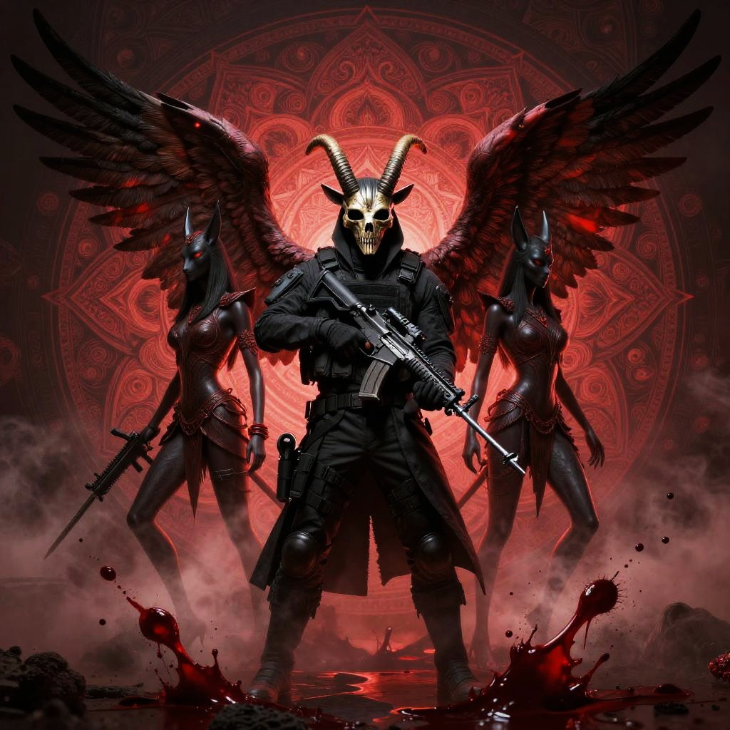 Highly detailed digital artwork featuring a male warrior with a goat horn skull mask and black tactical gear holding a semi-automatic rifle. He stands in front of a glowing red mandala background, flanked by two winged female demi-demons with Anubis-like black masks and dark armor. The scene is dark fantasy themed with blood splashes and fog, combining elements of occult, tactical combat, and Lovecraftian horror.