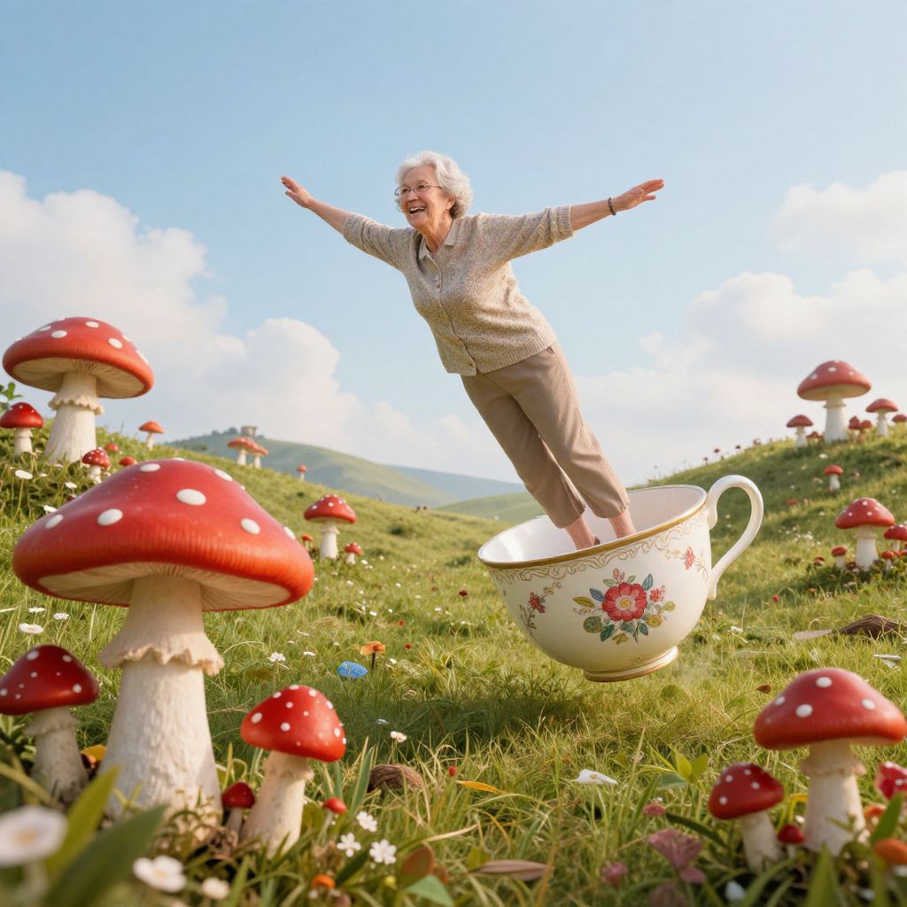 An elderly woman joyfully soars through a whimsical meadow of vibrant red mushrooms, perched atop a levitating teacup adorned with floral patterns, defying gravity in a dreamlike landscape where nature and fantasy intertwine.