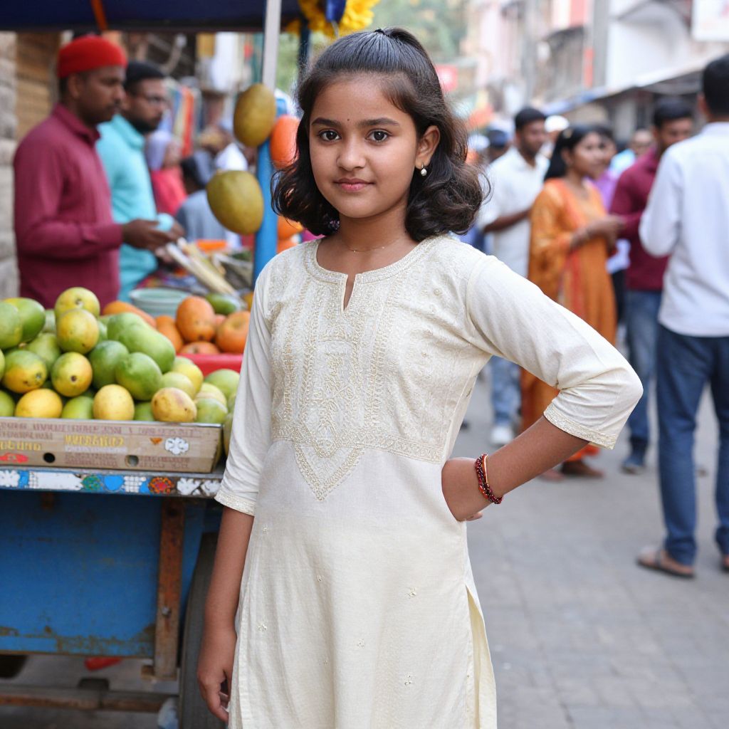 A candid, street-style photo of a girl in her early teens with a round face, soft brown skin, and dark wavy hair in a ponytail, dressed in a full samosa wali salwar costume, posing near a fruit cart in a lively South Asian neighborhood during a local cultural festival, with people in the background celebrating