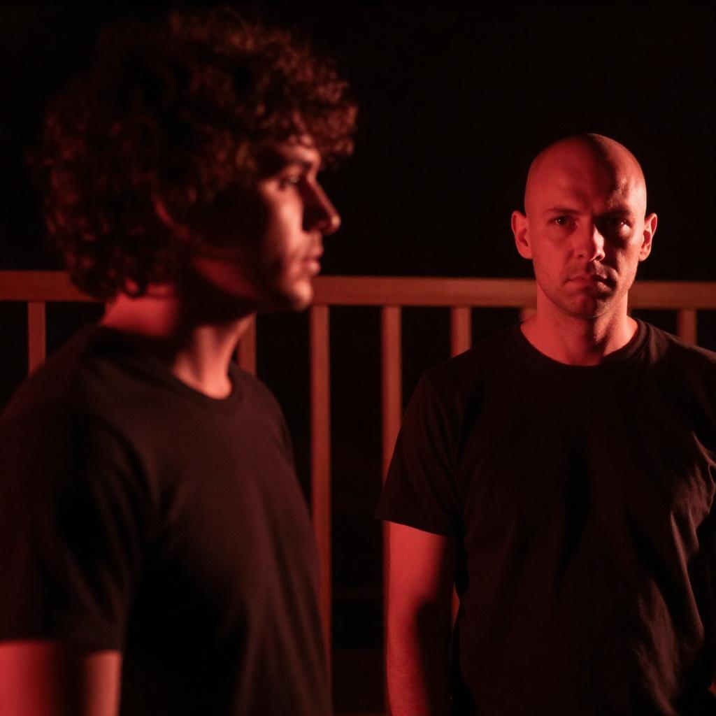 Two men in dim red lighting. Man on left with curly hair, facing right. Man on right, bald, serious expression, facing forward. Background: wooden railing, dark room. Both wear dark shirts. Red light casts shadows on their faces.