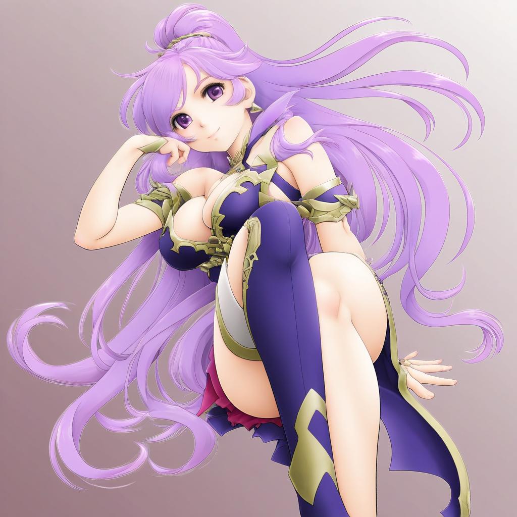 Ishtar (fire emblem), fire emblem, 1girl, purple eyes, purple hair, long hair, very long hair, ponytail, side ponytail, large breasts, cleavage, thighs, earrings, by artist fuji shinobu, leet