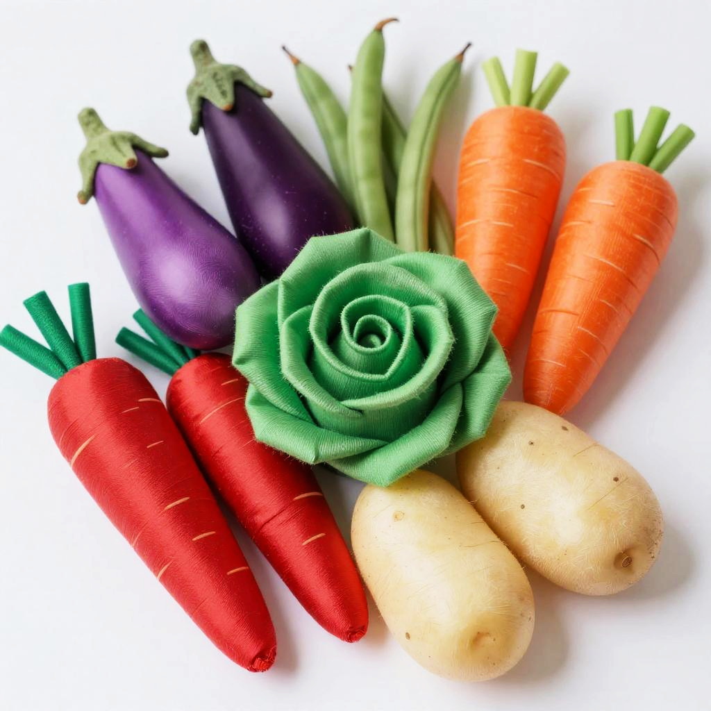 This is a colorful photograph of neatly folded fabric imitating various vegetables, arranged on a white background. The centerpiece is a green fabric rose, surrounded by bright red fabric carrots, orange fabric carrots, green fabric beans, purple fabric eggplants, and white fabric potatoes. The fabric textures mimic the shapes and colors of fresh produce, creating a playful, vibrant composition.