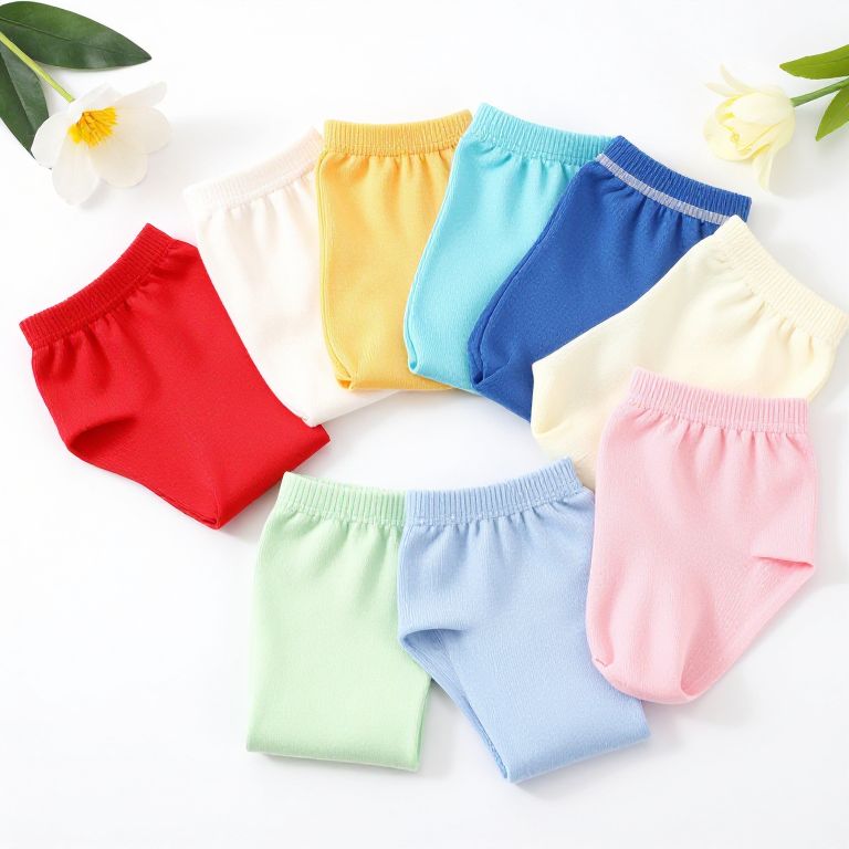 Varias pantaletas de diferentes estilos y colores vibrantes, cómodas y juveniles, dispuestas en abanico sobre una superficie blanca con accesorios suaves como flores y cintas, buscando transmitir una sensación alegre y fresca, estilo fotografía de producto.