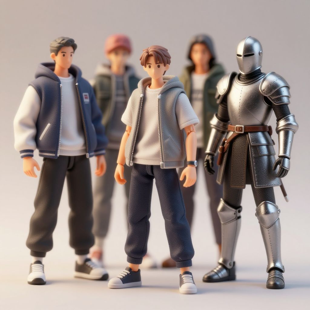 Figma clothes theme with diverse styles, including modern streetwear and medieval armor, worn by flexible plastic figures, soft natural light effect, sharp details on stitching and fabric folds, neutral backdrop enhancing the apparel features.