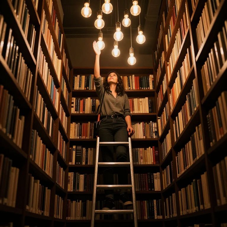 Librarian ascending a ladder amidst rows of bookshelves, reaching toward a cluster of suspended lightbulbs that illuminate the dimly lit library, each glowing orb casting a warm, inviting glow.