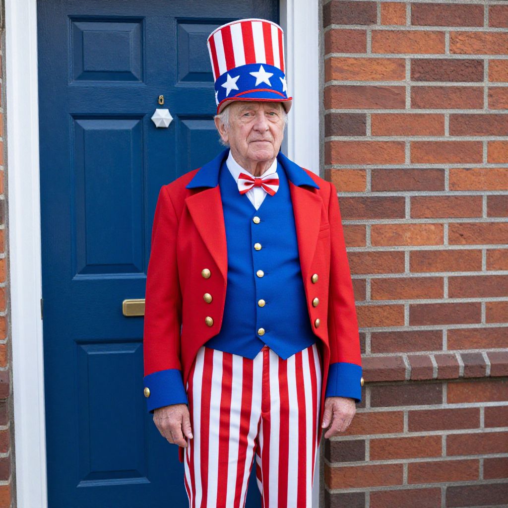 An elderly man stands confidently in front of a blue door beside a brick wall, dressed in a patriotic costume featuring red and white striped pants, a blue vest with gold buttons, a red coat, and a tall hat adorned with stars and stripes. His outfit blends vintage and theatrical styles with a festive and celebratory mood.