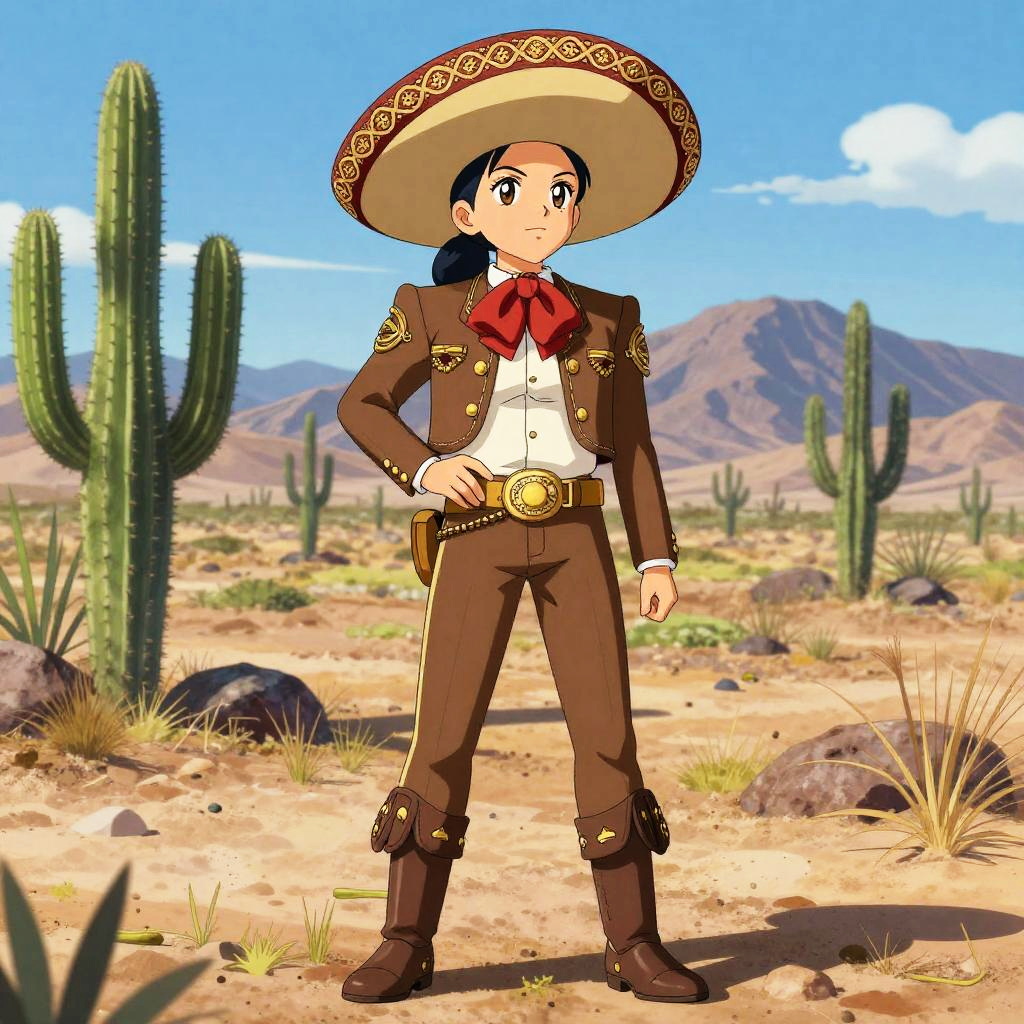 Mexican anime girl in classic charro outfit, standing confidently with a sombrero, desert landscape with cacti and mountains, bold colors and shadows, high detail anime illustration