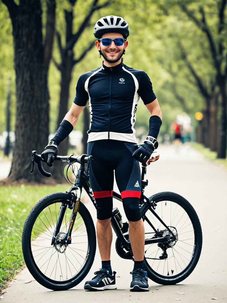 Bicycle, solo, 1boy, male focus, outdoors, fingerless gloves, gloves, bike shorts, tree, blurry, blurry background, helmet, full body, day, smile, sunglasses, sportswear, shorts, shoes, standing, short hair, black gloves, goggles, looking at viewer, multicolored clothes