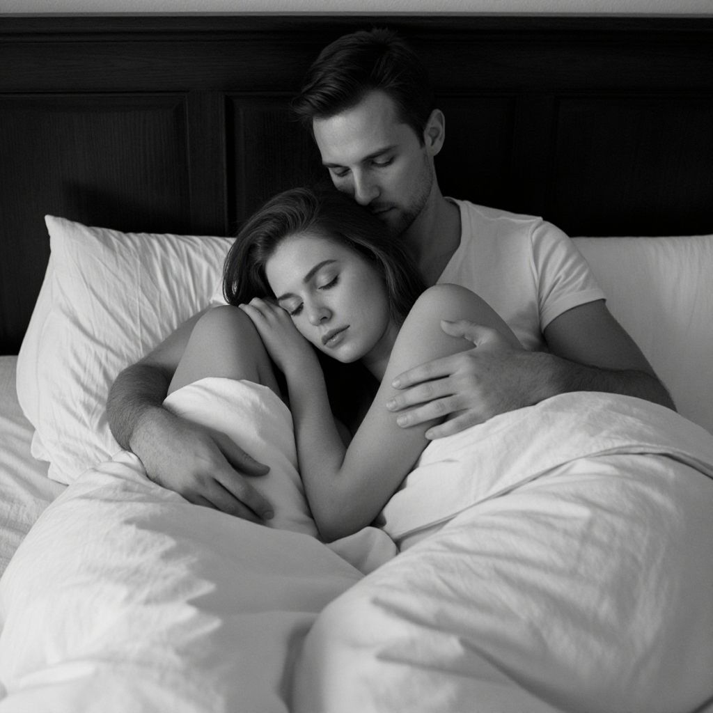 Intimate black-and-white portrait captures a man and woman lying together in bed, sharing a tender moment under soft bedding, with the man gently embracing the woman as they rest against a dark wooden headboard.