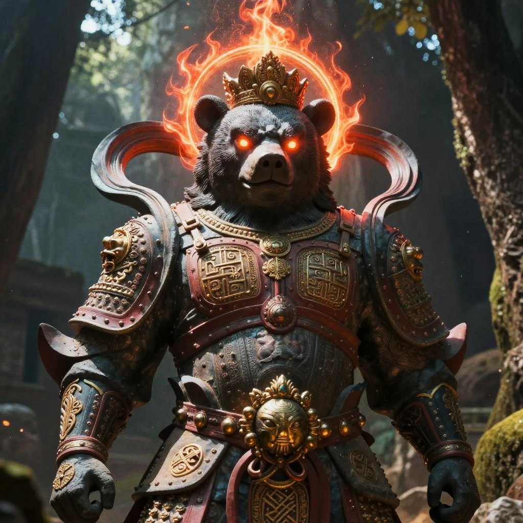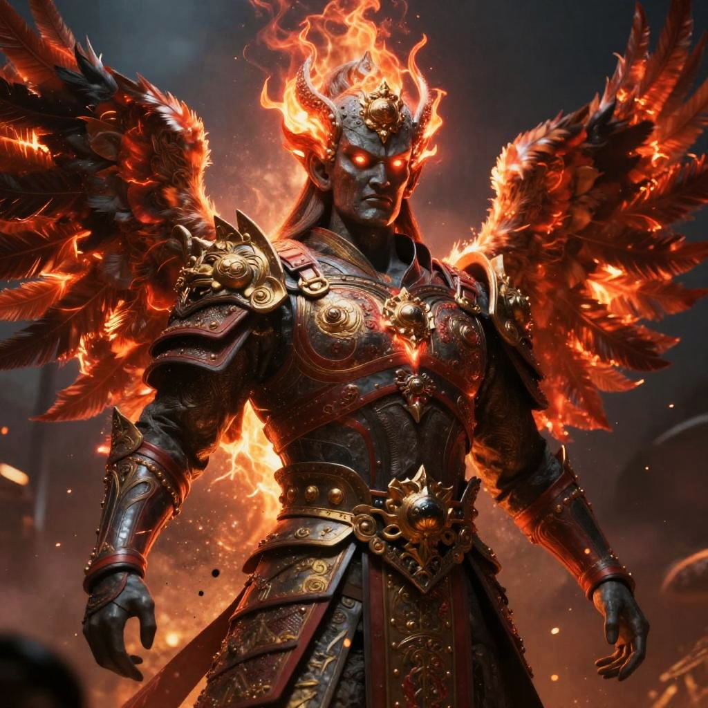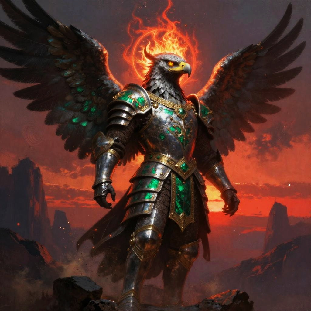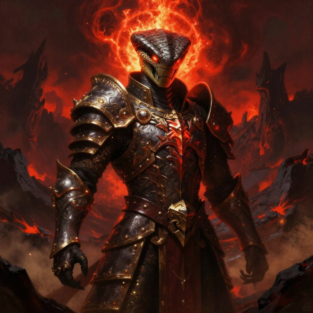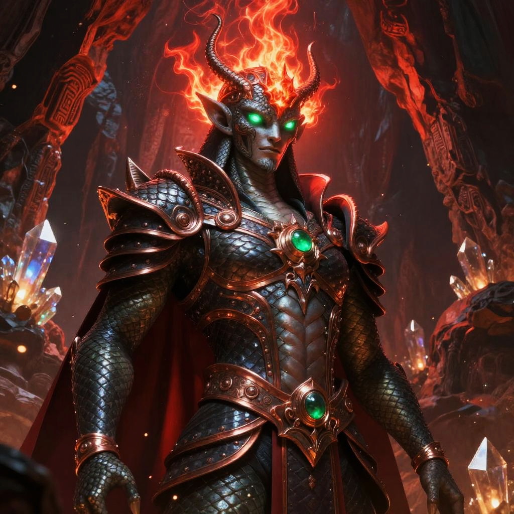 Surreal vibrant fantasy illustration of serpent-scaled royal guardian in crimson-hued cavern filled with flickering crystalline light, enigmatic stone-chiseled visage, glowing emerald eyes, ornate armor with obsidian and copper accents. Red flames or radiant energy halo the head, casting rim light; drifting embers and dust. High detail, volumetric glow, atmospheric depth, dynamic shadows, epic mood, painterly textures, mythic grandeur, cool-to-warm color contrast.