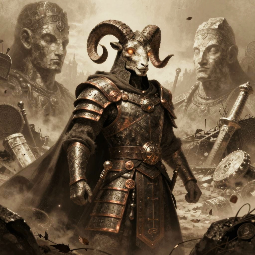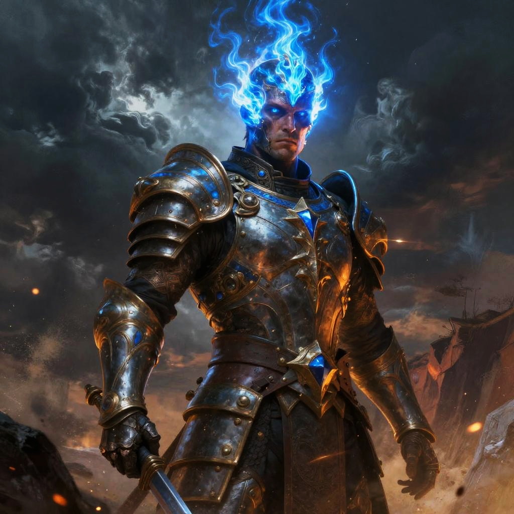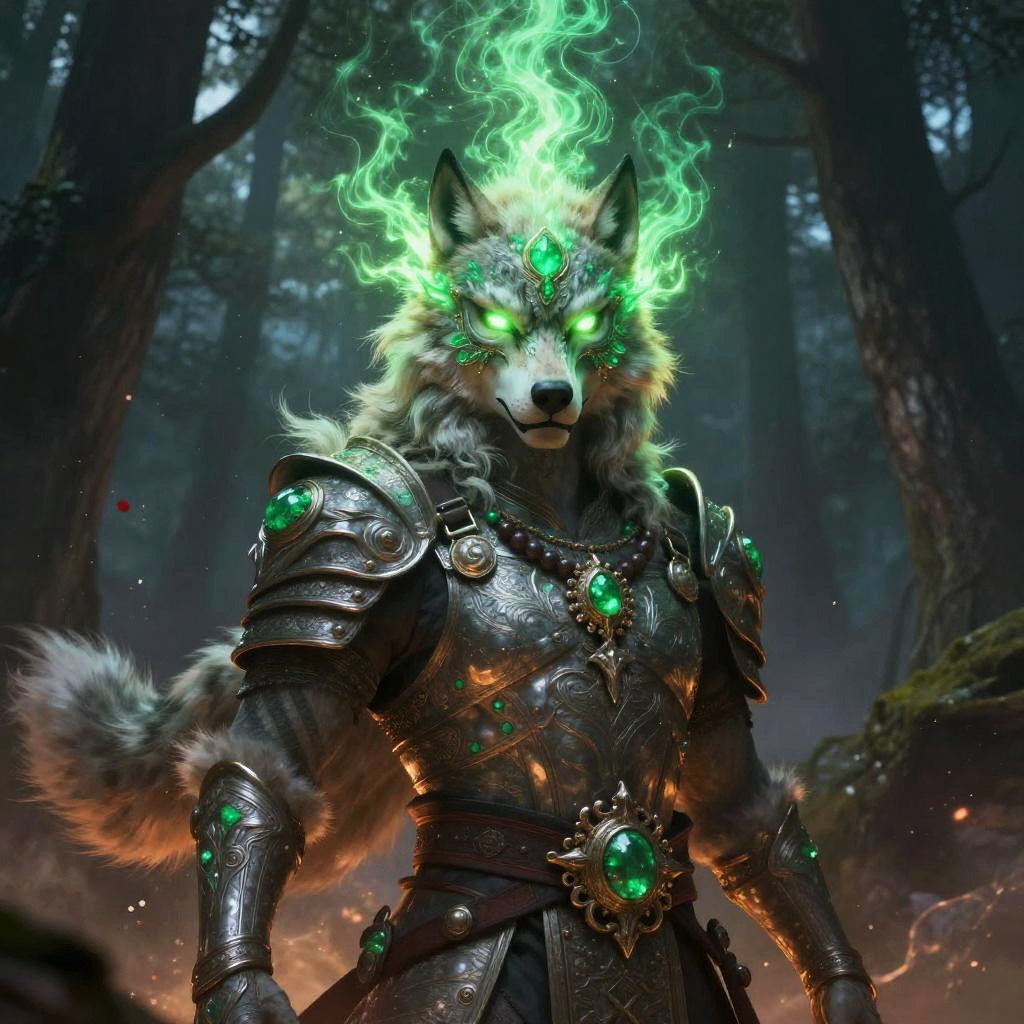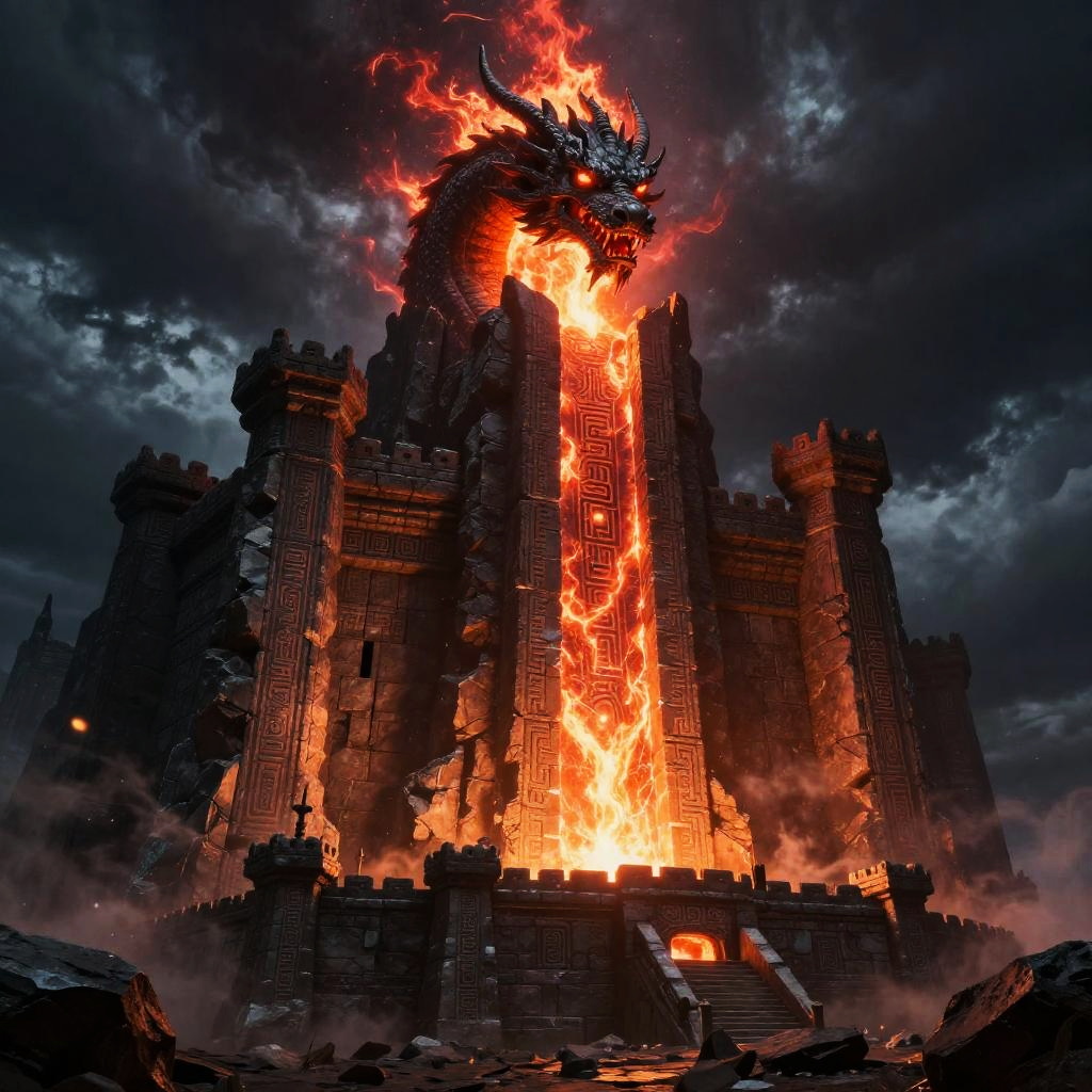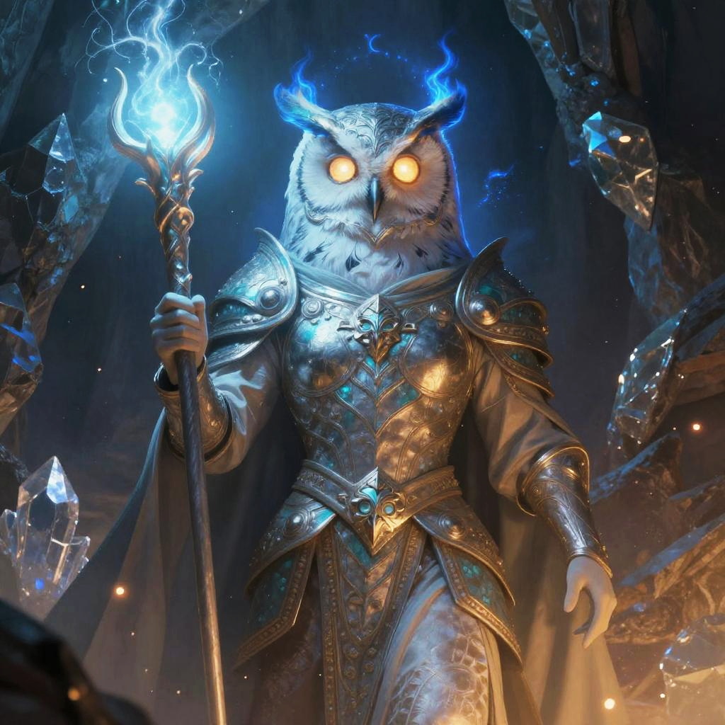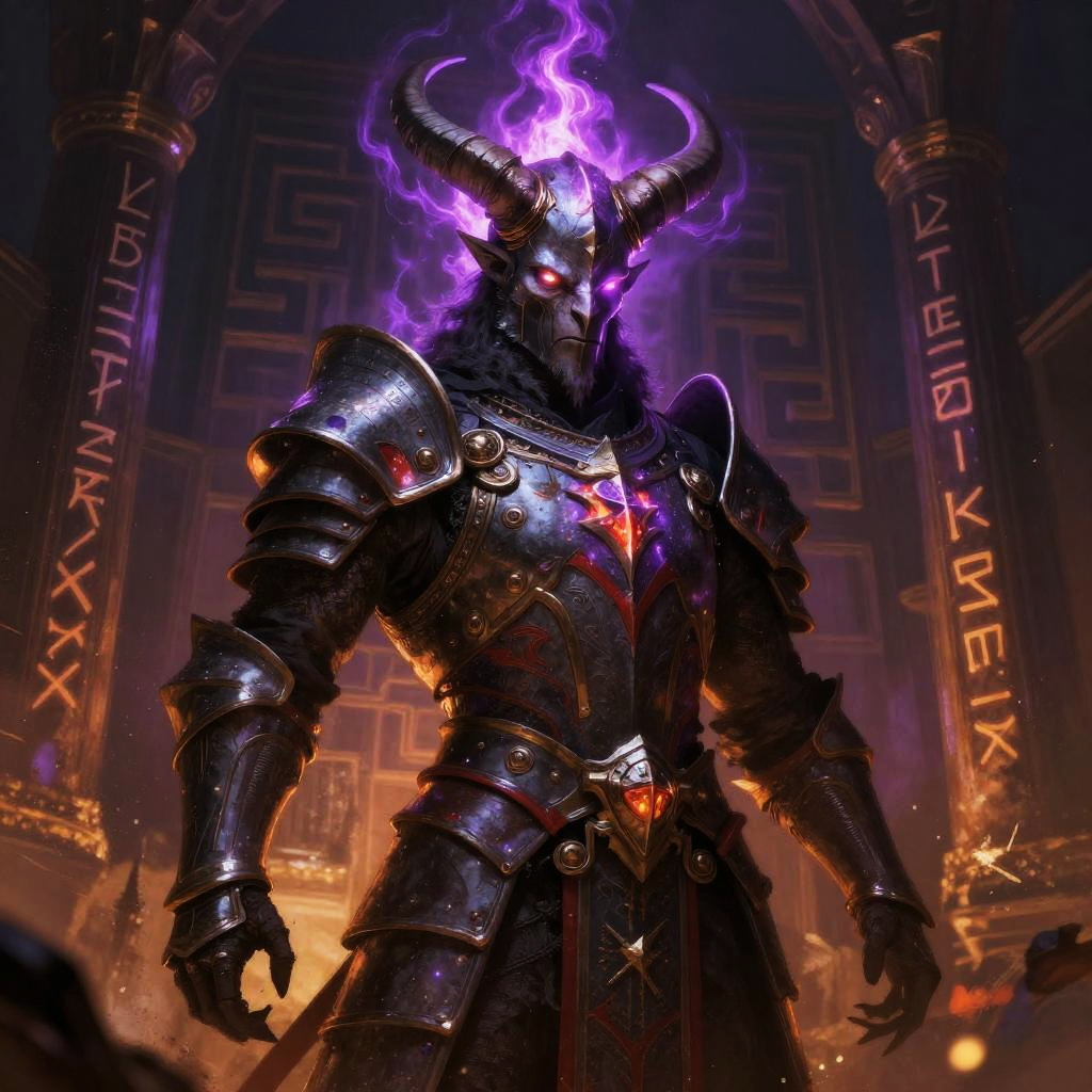 Surreal vibrant fantasy illustration of serpent-scaled royal guardian in crimson-hued cavern filled with flickering crystalline light, enigmatic stone-chiseled visage, glowing emerald eyes, ornate armor with obsidian and copper accents. Red flames or radiant energy halo the head, casting rim light; drifting embers and dust. High detail, volumetric glow, atmospheric depth, dynamic shadows, epic mood, painterly textures, mythic grandeur, cool-to-warm color contrast.