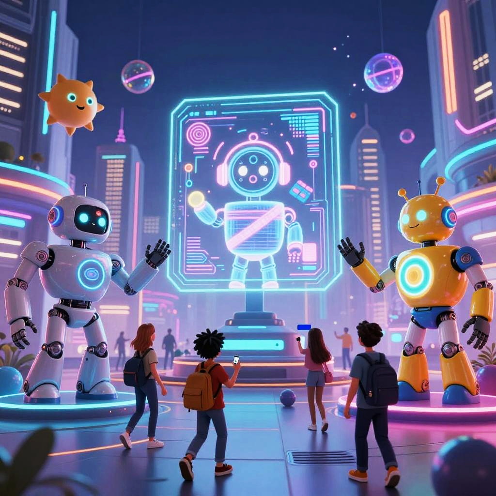 Futuristic cartoon generator AI robot creating lively animated characters on large holographic screens, neon light effects, vibrant color schemes, android hands adjusting sliders and palettes, blend of technology and creativity, ultra modern art style