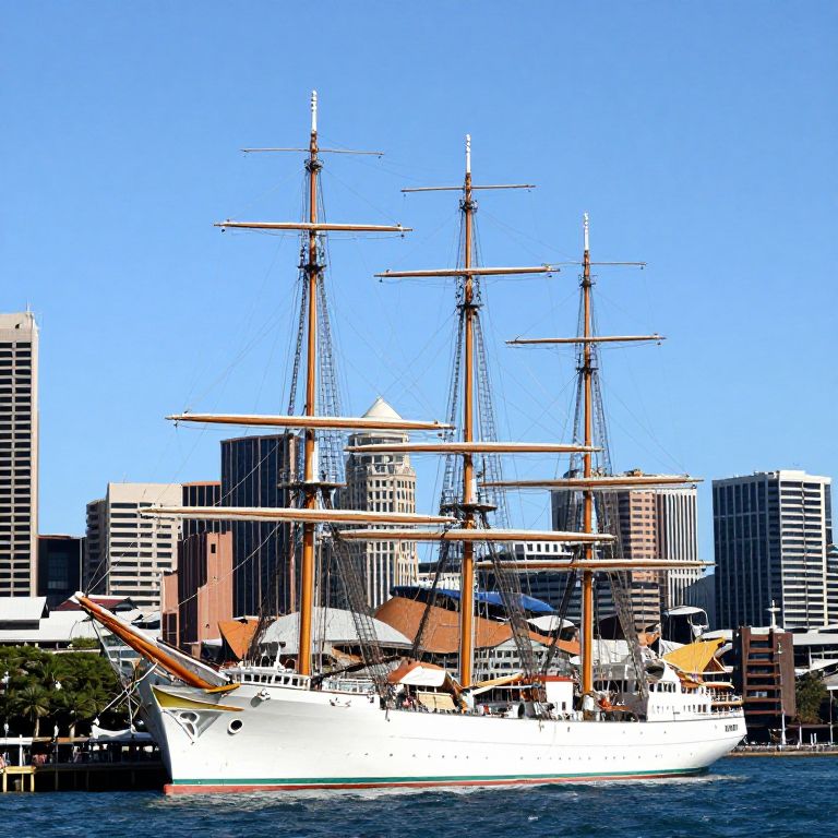 SS Ayrfield docked gracefully at the Sydney Harbour, showcasing its three towering masts and intricate rigging against a backdrop of vibrant city buildings and a clear blue sky.