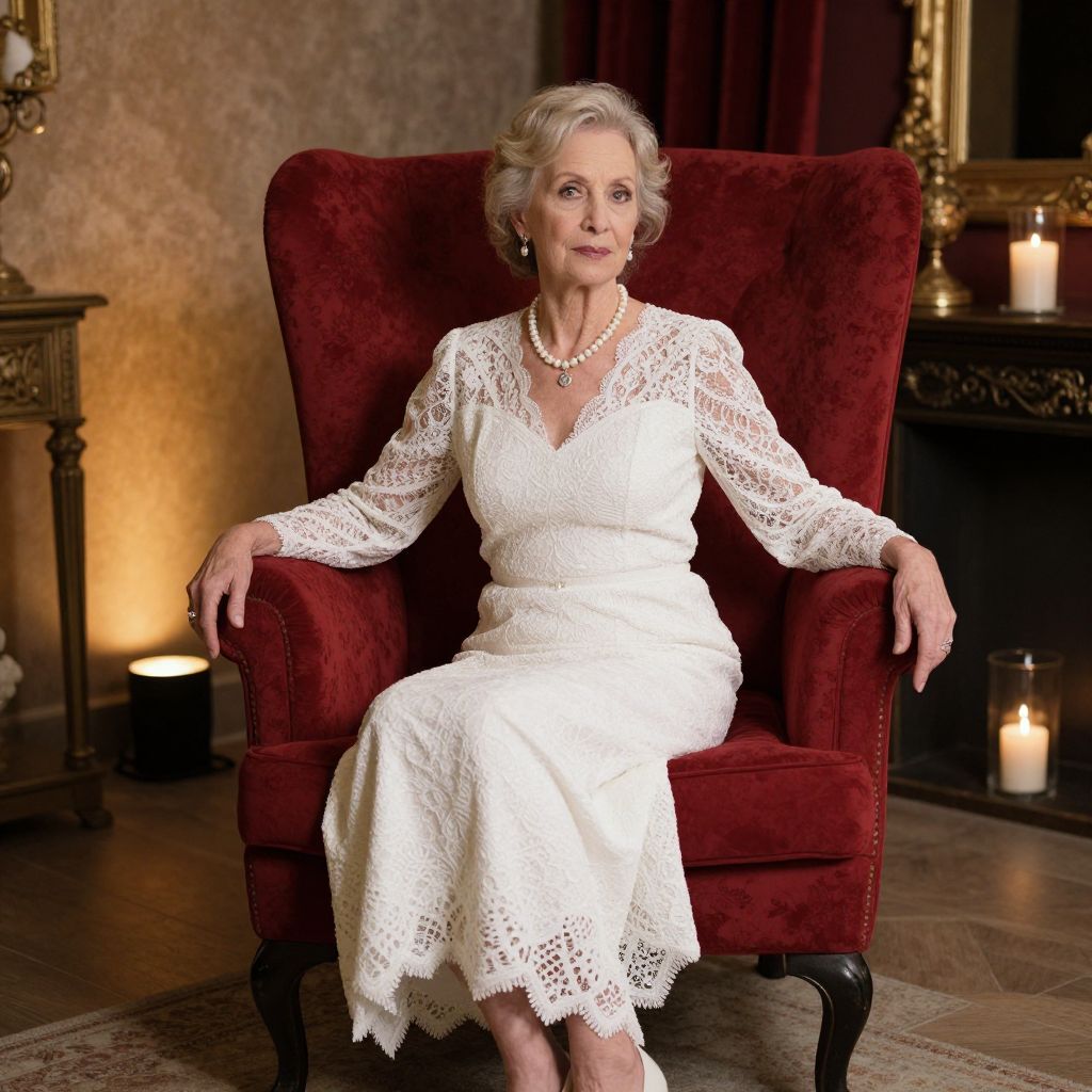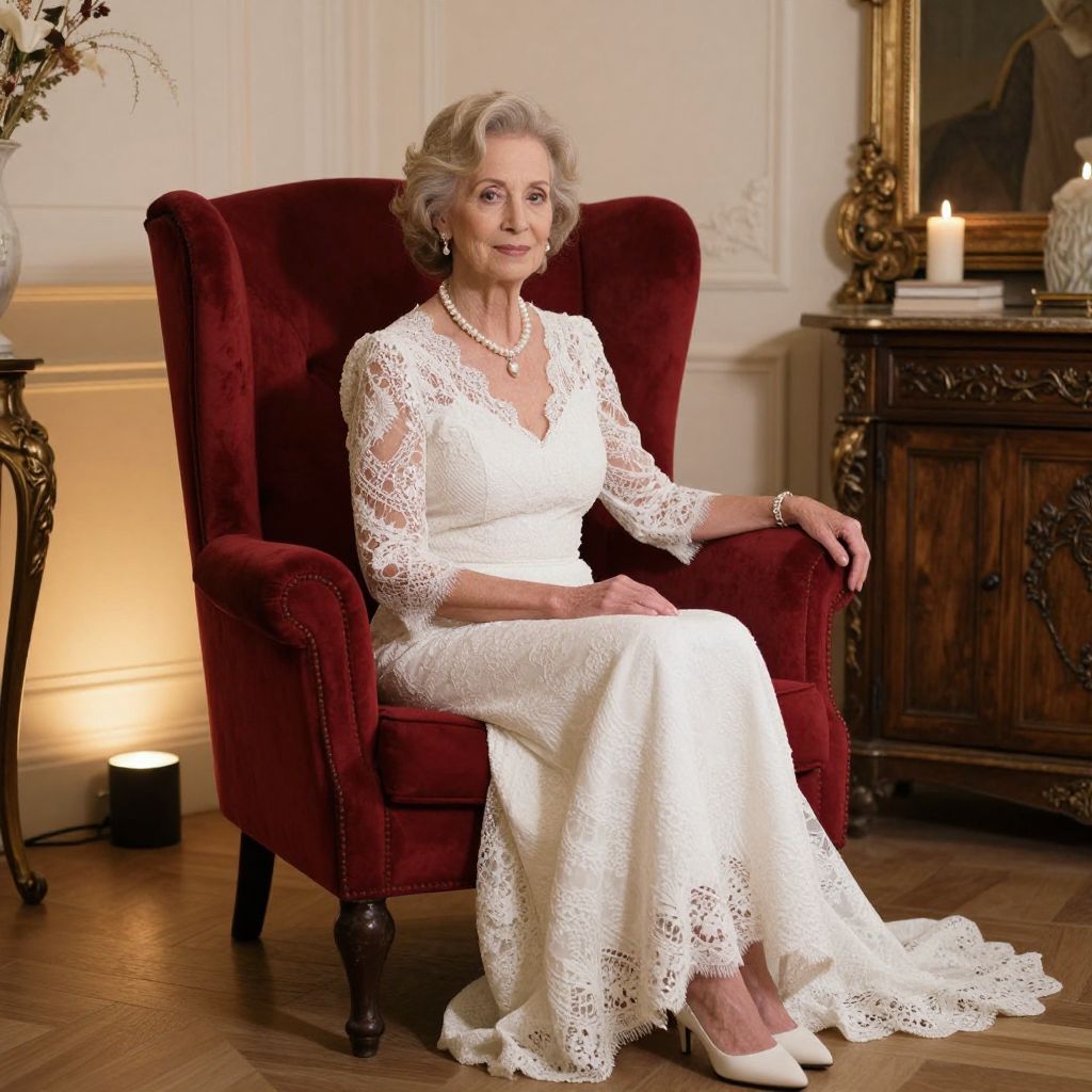 Photograph of an elderly Caucasian woman with silver, wavy hair, sitting in a plush, deep-red armchair. She wears a white, lace-trimmed, long-sleeve wedding dress with a V-neck, paired with white high heels, and a pearl necklace. Her skin is fair, and she has a gentle smile. The background features a wooden cabinet with ornate carvings, a lit candle, and a framed painting. The room has white, wainscoted walls and a wooden parquet floor. Soft, warm lighting adds a cozy ambiance to the elegant setting.