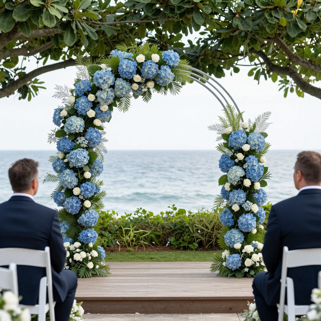 Photograph of an outdoor wedding ceremony. Two men in black suits with white shirts, seen from behind, sit on white chairs facing a blue and white floral archway. The arch, adorned with large blue hydrangeas and white flowers, is set against a backdrop of a calm ocean and lush greenery. Overhead, a leafy tree branches frame the scene. The wooden platform in front of the archway is simple, with a low hedge of greenery. The overall atmosphere is serene and romantic.