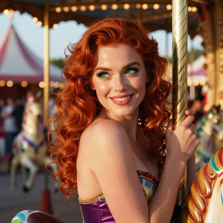 Imagine an ultra-realistic portrait of a mesmerizing circus performer with vibrant, rich red hair in soft curls cascading down her back. Her emerald green eyes, framed by long dark lashes, sparkle with life, and her full, pink lips curve into a warm, inviting smile. Standing tall amidst the lively carnival, the vibrant colors of the scene reflect off her face, illuminated by the surrounding lights and the laughter-filled air. Captured in a candid moment, she gazes off to the side, her expression a captivating mix of curiosity and allure, as she leans casually against a worn wooden carousel. The warm glow of the setting sun bathes her skin in a golden light, casting soft shadows that accentuate her features, creating an enchanting atmosphere in the fading daylight.