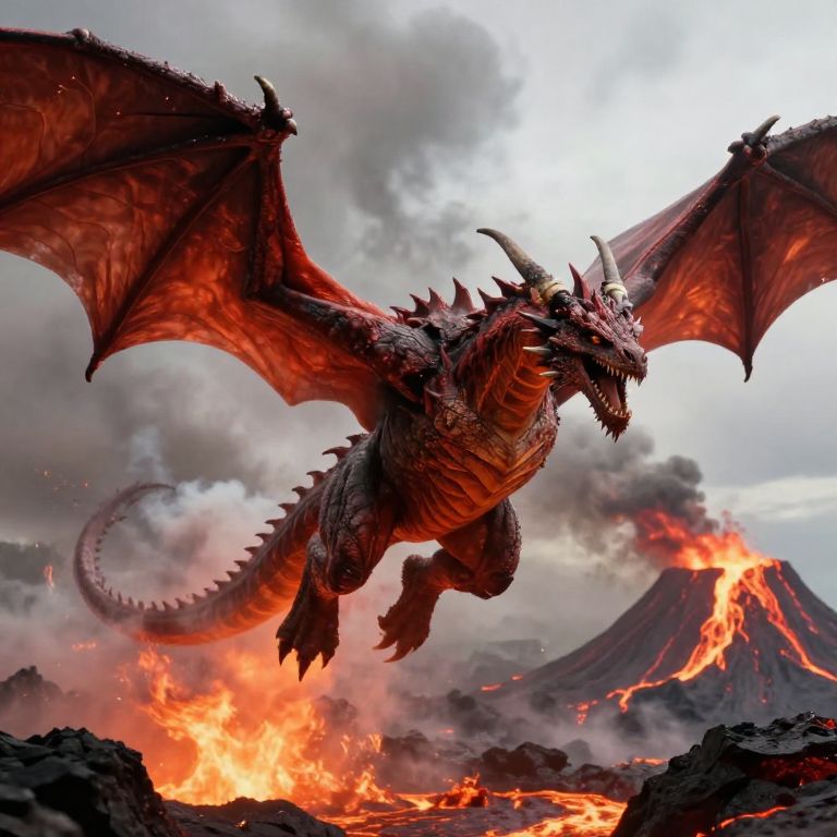 Digital artwork of a fierce red dragon with large wings soaring over a volcanic landscape, surrounded by flames and billowing smoke.