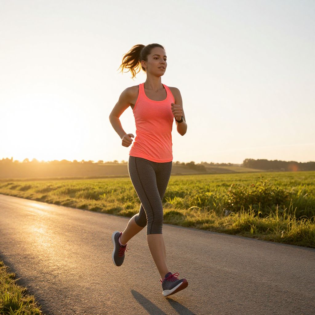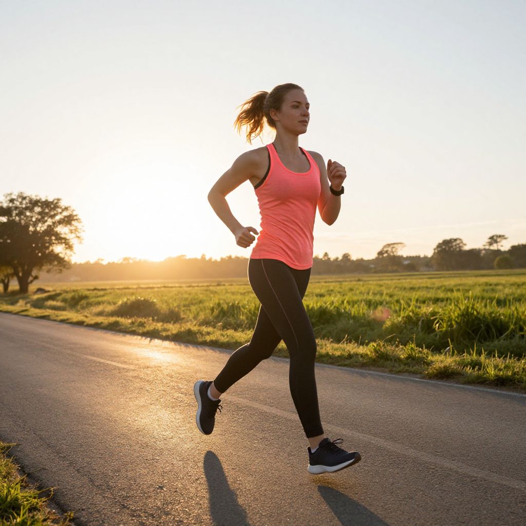 Energetic woman jogging along a sunlit road during a vibrant sunrise, embodying fitness and wellness in a serene outdoor setting.