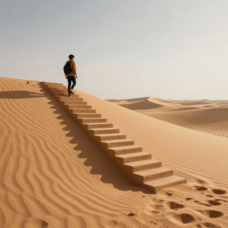 A solitary wanderer ascends a surreal staircase carved through an otherworldly desert, each step echoing the weight of introspection and the promise of untold horizons, where the air carries whispers of mystery and the earth hums with the ancient rhythm of unknown paths.